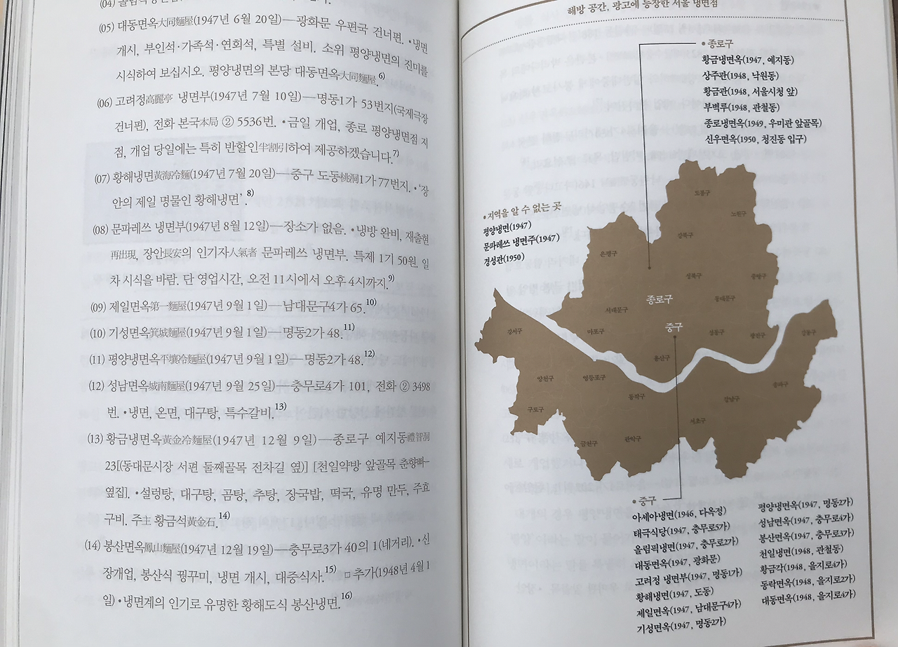 "1945~1950년 서울의 냉면점들이 이렇게 평양냉면을 내세운 것은, 일제강점기 서울의 냉면이 이미 평양냉면화되어 있었음을 의미할 터이다. 이 냉면점들은 또 다동, 충무로, 광화문, 명동, 남대문, 관철동, 예지동, 낙원동, 을지로, 시청 앞, 종로 등의 지명에서 알 수 있듯, 주로 서울의 좁은 중심지대 안에 있었다."
