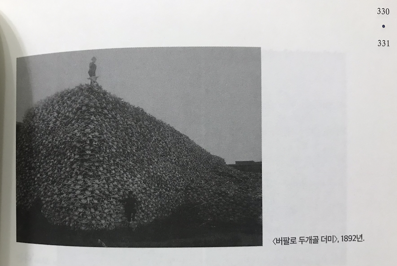 버팔로 사냥이 끝나자, 사람들은 곧 아프리카의 상아, 남태평양의 해양 자원, 남극의 고래로 손을 뻗었다. 돈이 되는 것이라면 무엇이든 상품화하는 자본주의의 욕망은 지금도 멈추지 않고 있다. 숲은 개발이라는 명분 아래 사라졌고, 전통문화는 관광 자원으로 가공되었으며, 지역의 자원과 노동은 글로벌 시장에 흡수되었다. 우리는 지금 기후 변화, 생물 다양성의 상실, 생태계 붕괴라는 전 지구적 위기 속에 살고 있다. 그 뿌리 깊은 위기의 출발점에는 19세기 세계화가 보여 준 무분별한 자연 소비의 방식이 자리하고 있다. 버팔로 사냥은 그 파괴적 흐름을 예고한 첫 경고장이었다."