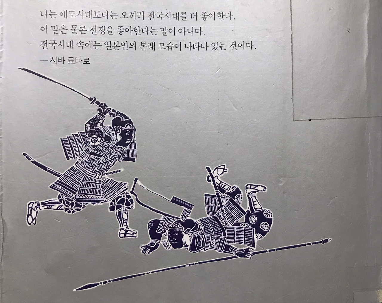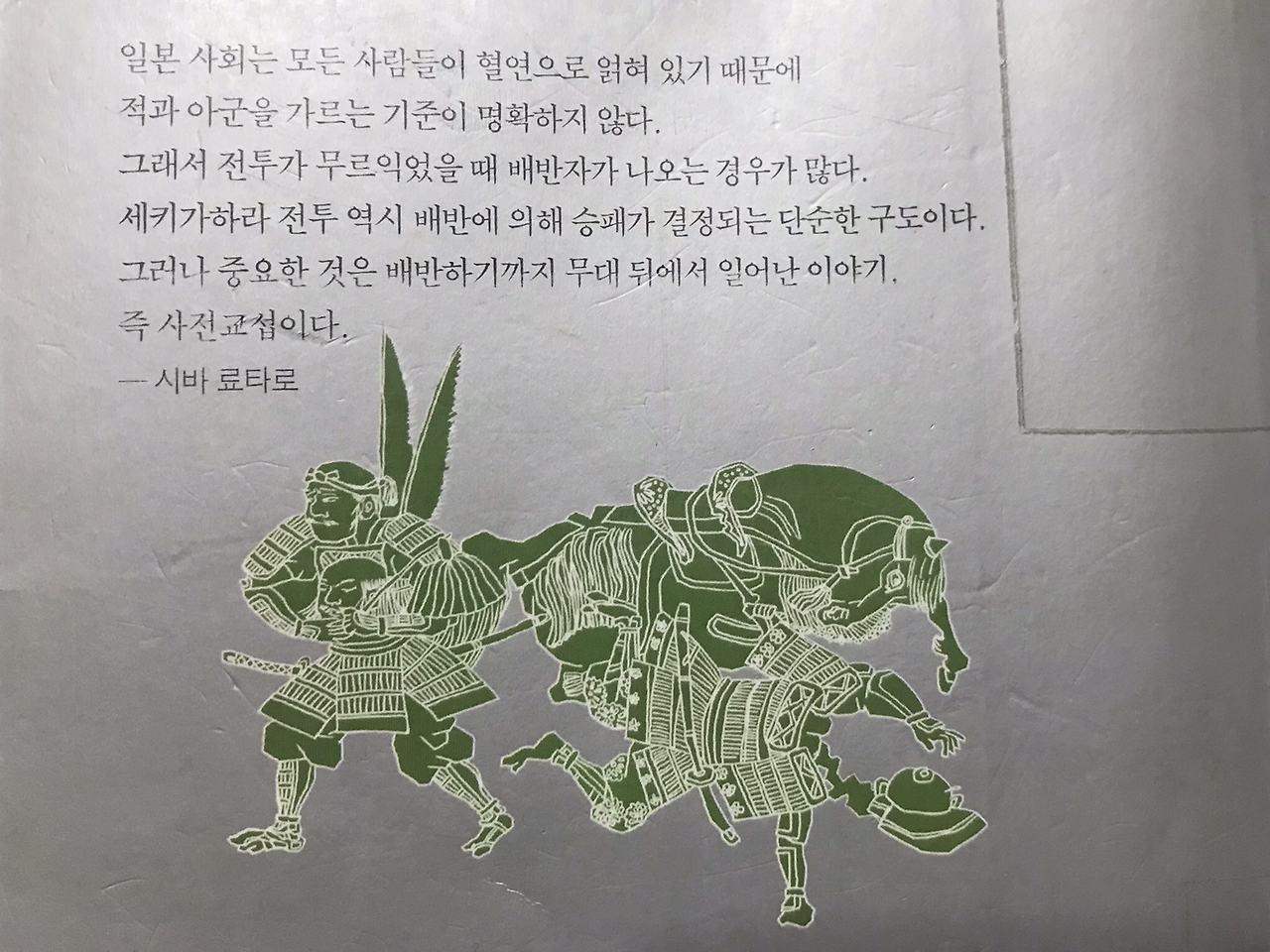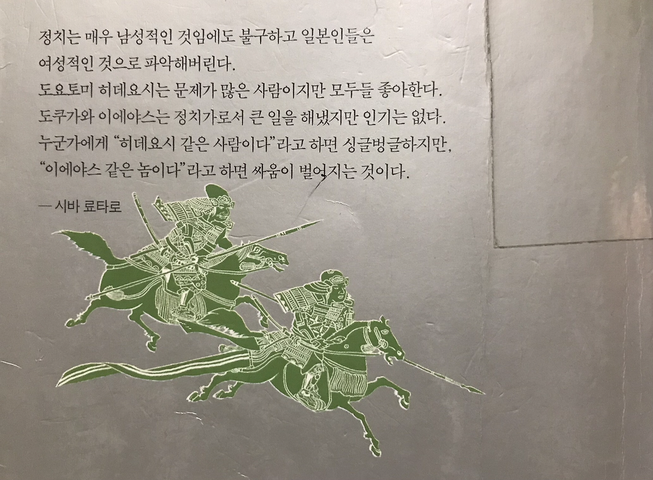 "(도쿠가와) 이에야스라는 사내는 워낙 기분의 변화가 별로 없는 성격이었다... (오다) 노부나가... 성격이 까다로운 사람... (도요토미) 히데요시는 막힌 데 없이 쾌활한 사람... 쾌활함을 더욱 연출하여 인심을 수렴하는 데 쓰기도 했다. 이에야스의 성격에는 노부나가라든가 히데요시와 같은 선명한 색채감이 없었다... 어둡고 가라앉은 중간색... 워낙 기분의 변화가 별로 없는 성격이었지만 그 스스로가 그렇게 되려고 노력하기도 했다... 노부나가와 히데요시에게는 평생토록 어린애 같은 데가 있어서 기쁠 때는 몹시 들뜨기도 했지만, 이에야스는 나면서부터 애늙은이 같은 데가 좀 있었다. 점잖은 미소를 띠고 있는 정도의 상태이면 이 남자의 마음 속에 즐거움이 파도치고 있을 때였다."