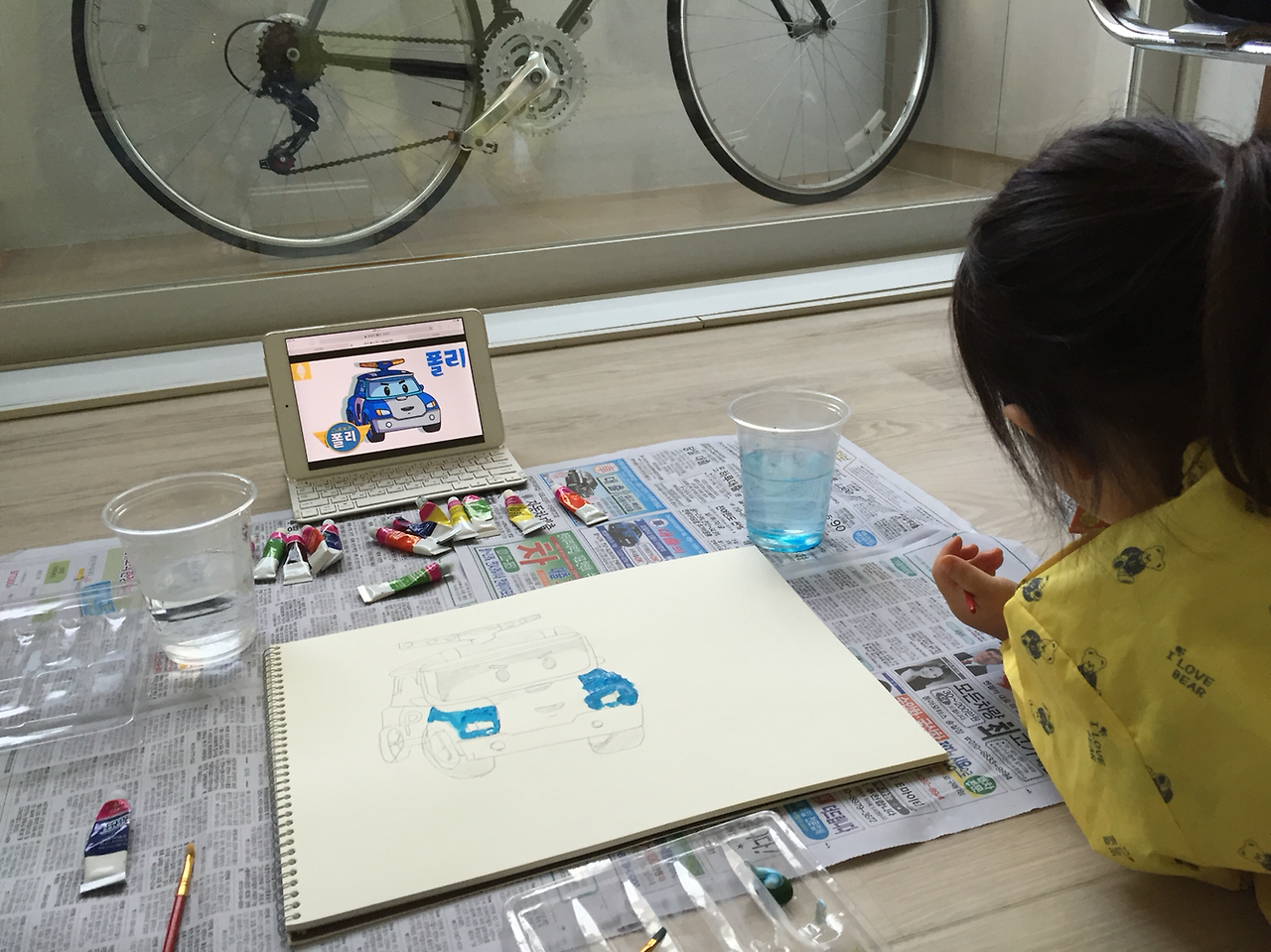 아이가 색깔을 참고할 수 있는 레퍼런스를 태블릿이나 노트북에 담아서 보여주는 것도 방법이다. 기대했던 것과 다른 색상으로 채색하거나 부가적으로 표현하고 싶어 할 때는 그렇게 의도한 이유가 무엇인지 물어보고 호응해주는 것도 중요하다.