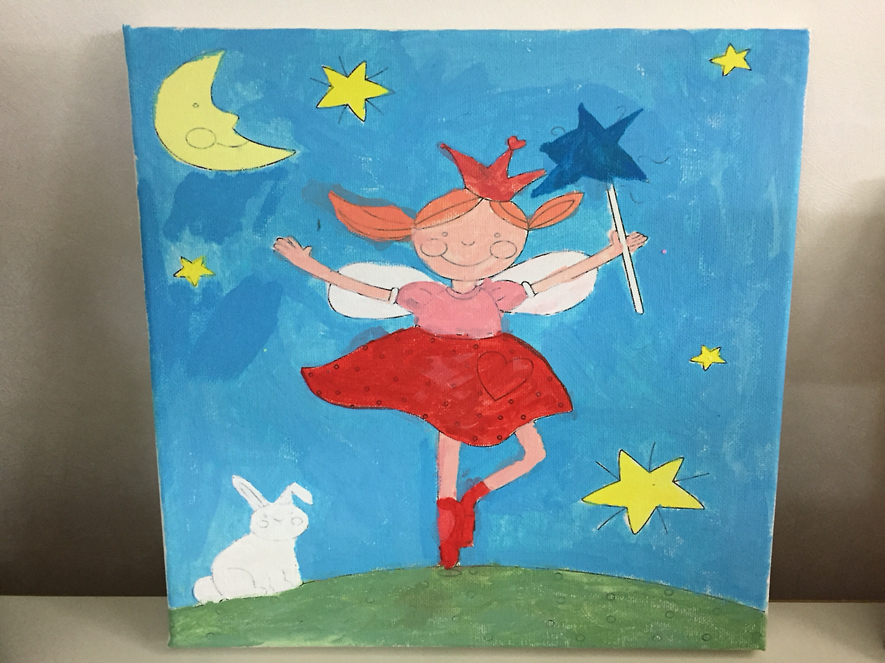 이미 캔버스 위에 스케치가 되어 있고, 채색의 난이도도 어렵지 않았다. 붓과 물감이 함께 들어있고, 팔레트로 활용할 수 있는 플라스틱 판도 패키지로 포함되어 있어서 유용하다.