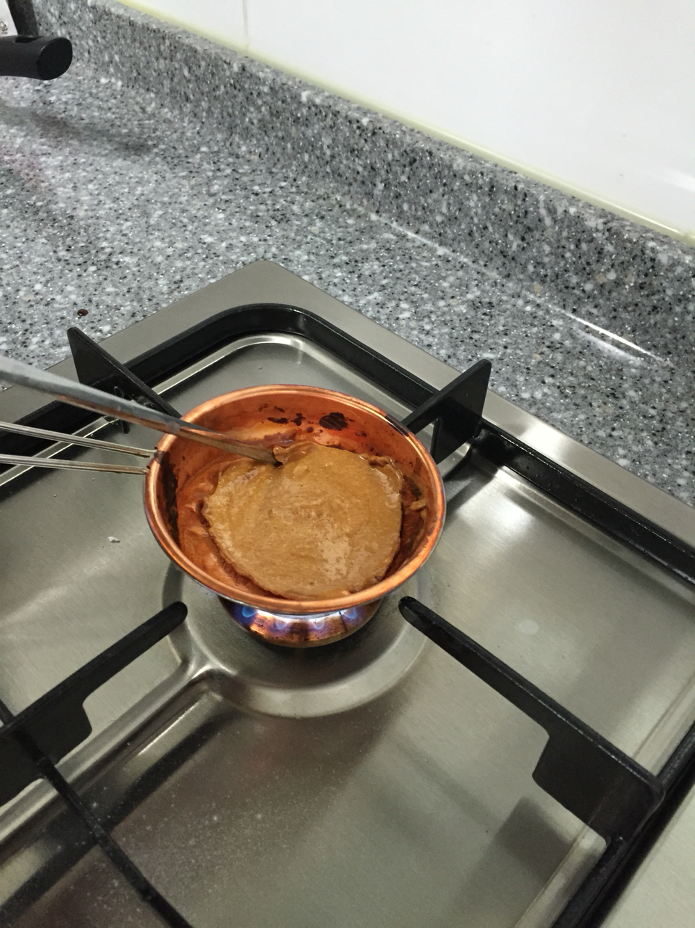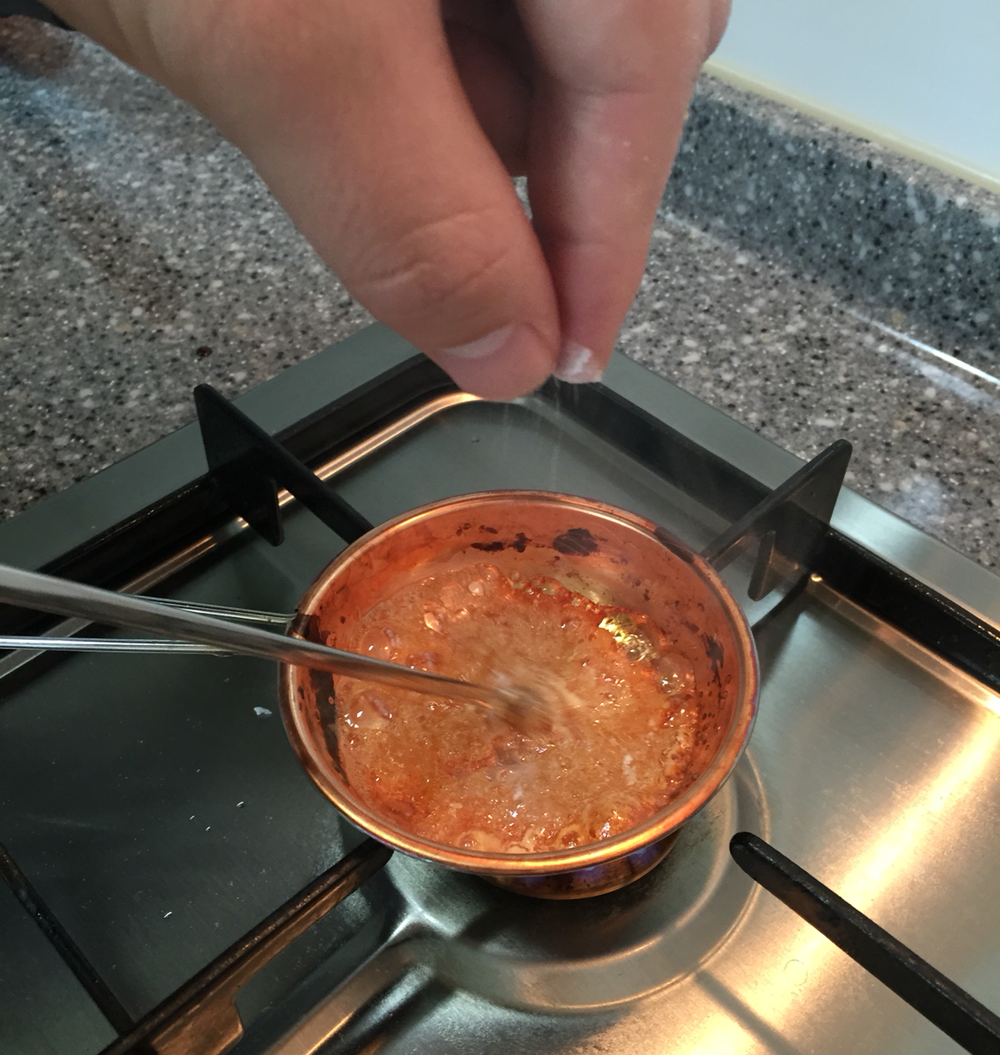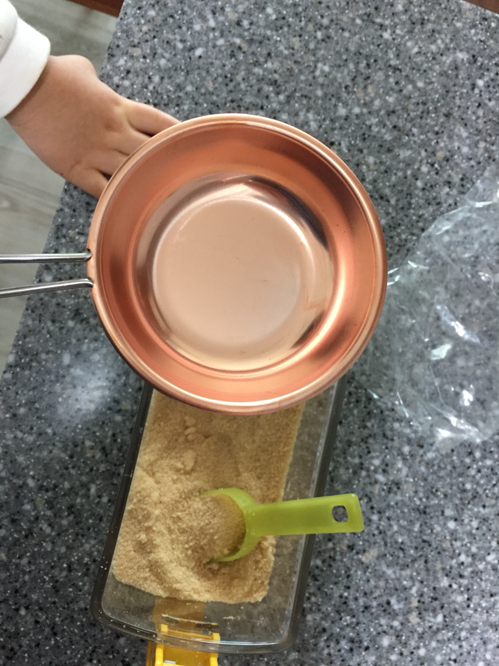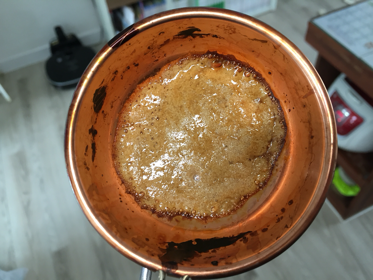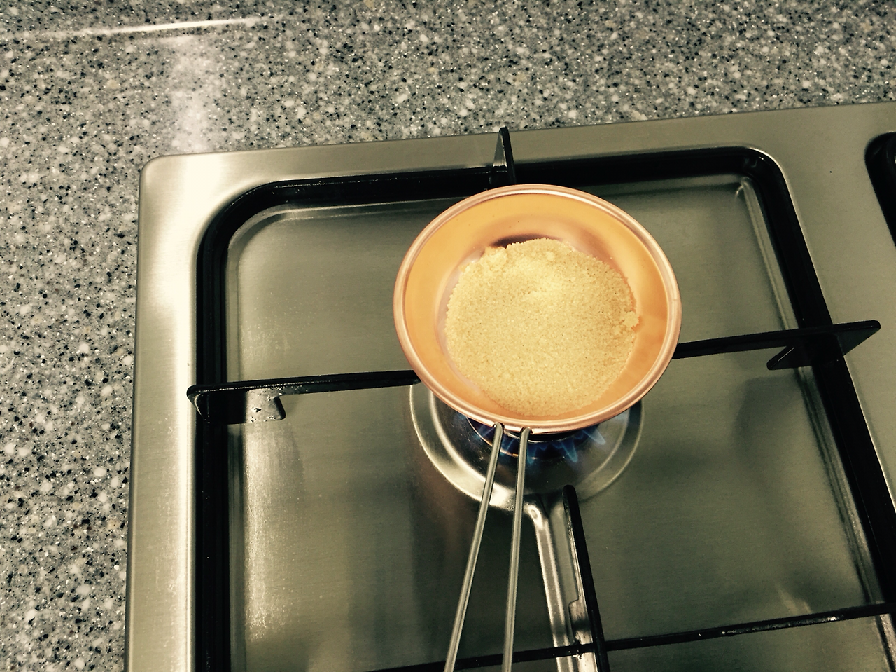 잘 젓지 않으면 금세 탄다. 설탕 가루가 액체가 될 때 바로 소다를 넣어서 태우지 않고 부풀어 오르게 하는 게 중요하다.