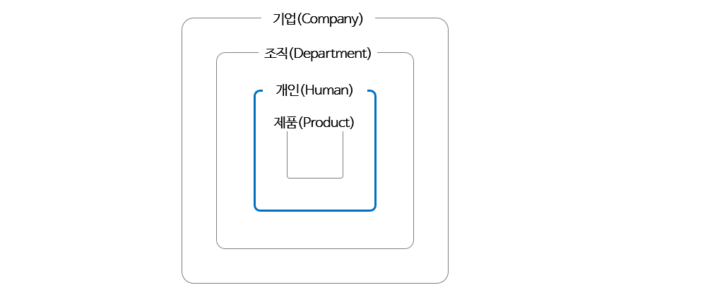 기업은 가장 큰 범위부터 순서대로 나열하면 기업, 조직, 개인의 3요소로 구성된다. 그리고 여기에 기업이 생산하는 ‘제품’을 추가하면 4가지 요소가 된다. 즉 상위에서 하위의 개념으로 기업, 조직, 개인, 제품의 순서로 나열된다.