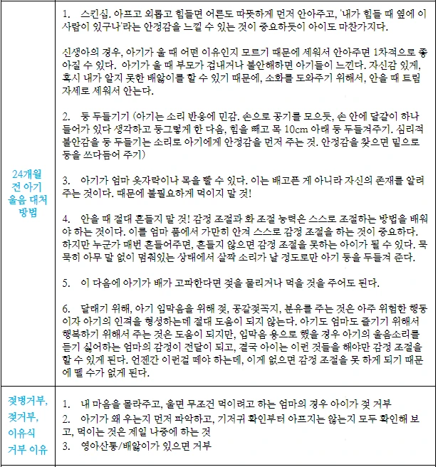 말을 시작하면서 떼쓰기가 시작되는 2세~3세부터는 감정 조절 능력을 키워주는 것이 중요하지만, 24개월 전에 아기가 우는 것은 아기의 생존에 직결되는 것이기 때문에, 무조건적으로 부모가 아기를 이해해 주고, 보호해 주고, 사랑으로 감싸주고, 아이의 불편함을 해소시켜주어야 한다. (내가 작성한 2세~3세 울고 떼쓰는 아이들의 감정 조절 능력 관련 글도 함께 읽어보시길 바란다.)