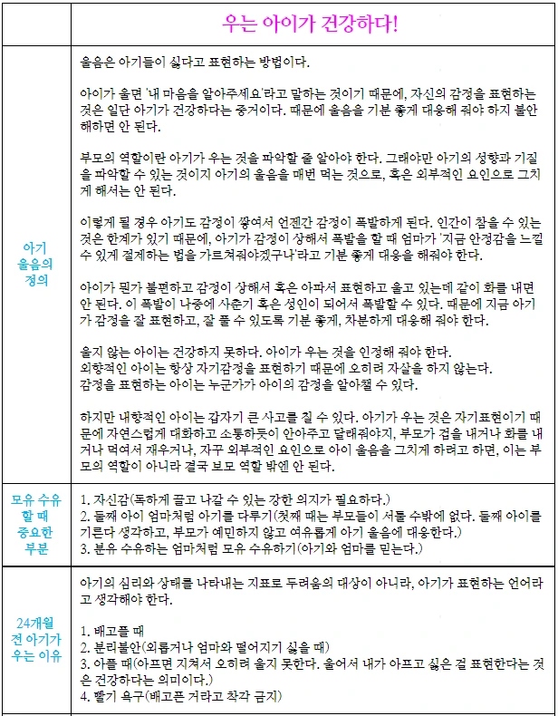아기가 울지 않으면 오히려 병원에 가봐야 한다. 아기가 우는 것은 아기가 지금 너무 정상적으로 잘 크고 있어서 우는 것이고, 아기가 건강하다는 신호이기 때문에 부모는 아기가 우는 것에 감사해야 한다. 어른들이 말로 표현하듯 말 못하는 아이들은 울음으로 표현한다. 아이가 울면, 운다고 생각하지 말고, 부모에게 '무엇인가 말을 하고 싶구나'라고 생각해야한다. 아이가 울음으로 자신의 마음을 표현하고 싶다고 생각해야한다. 부모는 아이가 무슨 말을 하고 싶은건지 아이의 마음을 알려고 노력해야한다. 그리고 그 문제를 해결해 주어야한다.