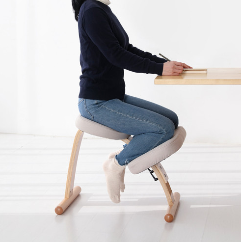 그래도 통증이 계속되자 이번에는 의자를 바꿔보자고 하셨다. 인터넷에서 검색을 해보면 '자세교정의자' 혹은 '허리, 척추, 목 디스크 교정 의자'라고 있으니 그걸 써보라고 하셨다. 몇 년 전만 해도 30만 원대로 사야 했지만 지금은 기술이 좋아져서 7~8만 원 대로도 좋은 의자를 살 수 있을 거라고 말씀하셨다. 의자가 아래로 기울어져 있고 무릎을 받치는 형태인데, 아래 사진에서 볼 수 있는 것처럼 목과 허리가 완전히 쫙 펴질 수밖에 없는 형태를 하고 있다. 이 의자도 바로 사서 테스트를 해봤고 남편이 내가 앉아있는 사진을 찍어본 결과, 아무런 힘을 주지 않아도 이 의자에 앉아있는 것만으로도 허리, 척추, 어깨, 목이 일자로 자연스럽게 쫙 펴지기 때문에 자세가 자연스럽게 교정되는 의자였다.