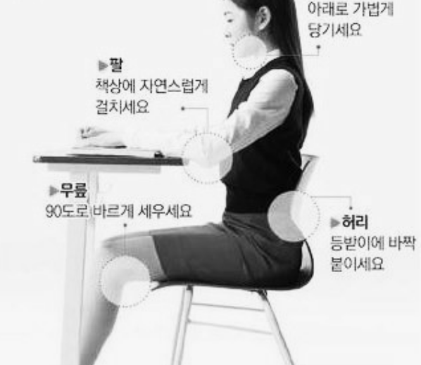김연아 선수가 올바르게 책상에 앉는 자세를 선보이고 있다. 이처럼 책상에 팔이 자연스럽게 걸쳐져야 어깨에 긴장과 힘이 들어가지 않고 목이 앞으로 쏠리지 않게 된다.