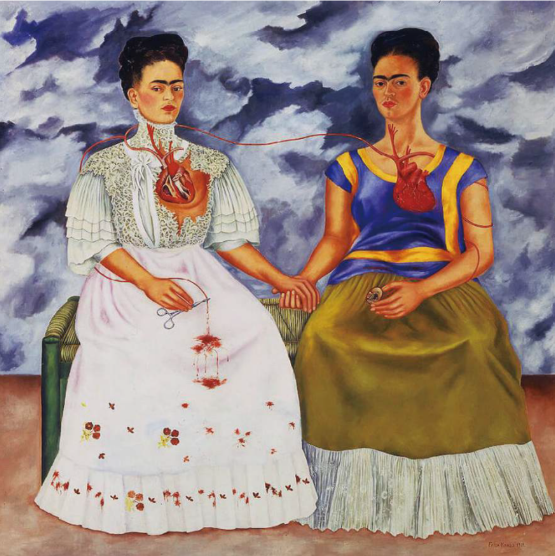 오른쪽 여성은 멕시코 전통의상을 입고 있고, 왼쪽 여성은 유럽풍 의상을 입고 있다. 그리고 심장이 혈관으로 서로 연결되어 있다. 오른쪽 여성은 디에고의 어린 시절의 사진을 손에 쥐고 있다. 하지만 왼쪽 여성이 그 혈관을 가위로 잘라버린 모습을 볼 수 있다. 이 그림을 통해 프리다가 하고 싶은 말이 무엇이었을까? 프리다의 음성이 들리는 것 같지 않은가?