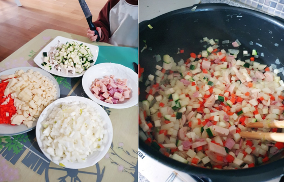 아빠의 지도에 따라 안전하게 직접 칼로 채소를 작게 썰어서 야채스프도 만든다. 자신이 만든 요리에 애정을 갖고 뿌듯함과 보람을 느껴서, 더 맛있게 잘 먹는다.^^