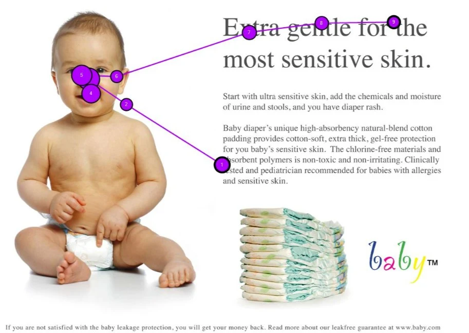 녹색과 붉은 점은 시선 이동에 따른 열감지 분포도인데, 붉은색에 가까울수록 소비자의 시선이 오래 머물렀다는 것을 알 수 있다. 위 사진에서는 아이의 얼굴에 가장 오랜 시간 시선이 머물렀고, 광고 문구에는 상대적으로 적은 시선이 이동했다는 것을 알 수 있다.