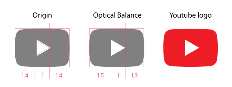 Youtube는 시각적 보정을 통해 세모의 위치를 조금 뒤로 수정해 균형 잡힌 디자인을 완성했다.