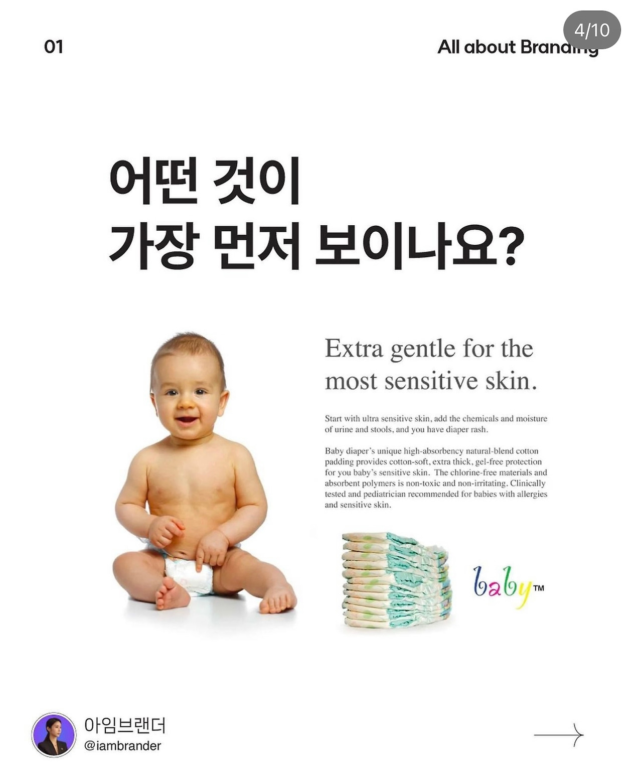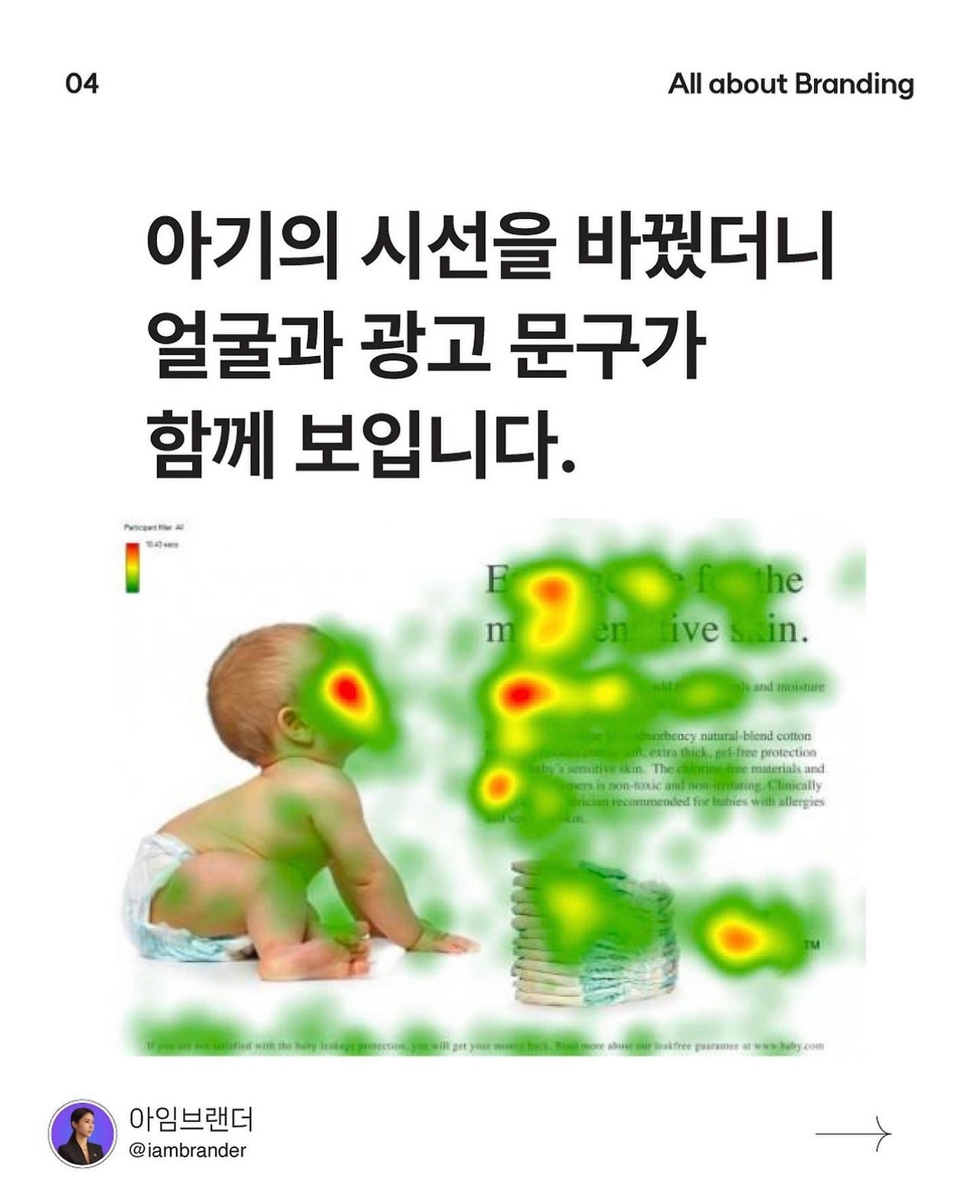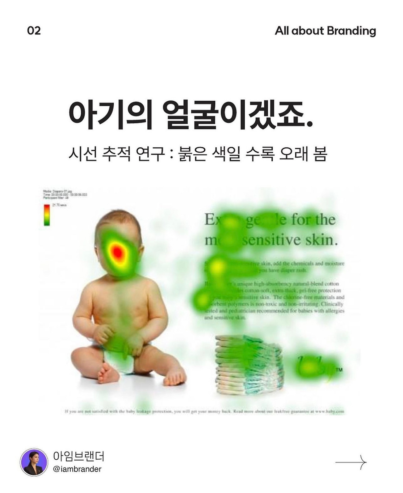 피실험 자들의 시선에 추적해 보았을 때 대부분의 사람들의 첫 번째 시선 그리고 오래 머무르는 시선에 위치는 아기에 얼굴이었다.