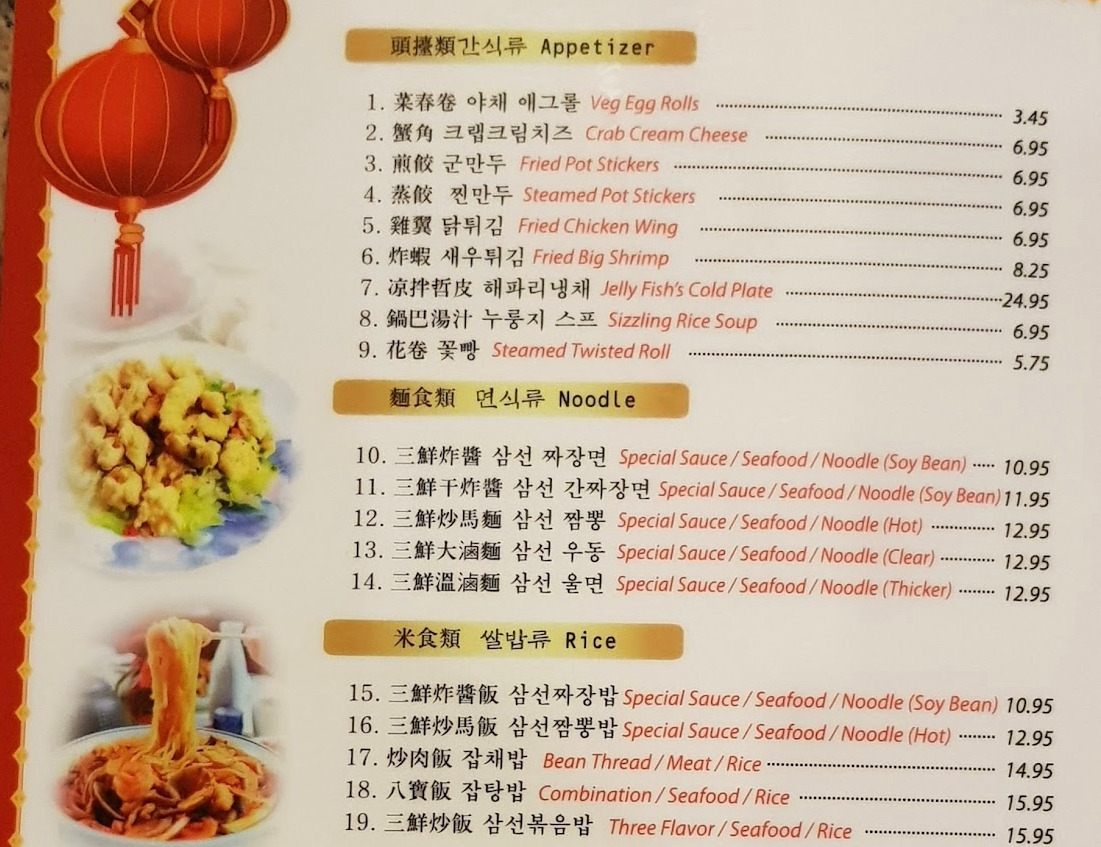 식당의 입구엔 영어로 (참고로 내가 사는 곳은 미국이다), Chinese(중식), Japanese(일식), Thai(태국식)라고 쓰여있었고, 한편에는 한국어로 ‘중화요리’라고도 쓰여있었다.