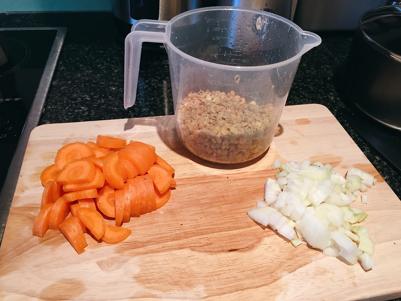 1. 렌틸콩 반컵, 당근 한 개, 양파 한 개를 썰어서 준비한다