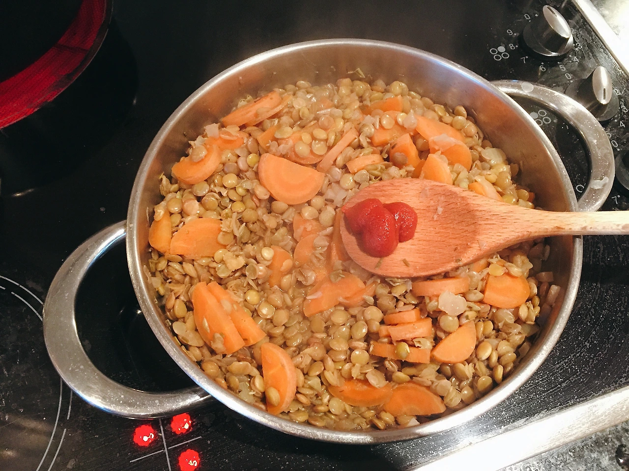 3. 렌틸콩 반컵을 넣어서 같이 섞으면서 볶아주다가 물을 2컵 정도 넣고 중불로 끓여준다.