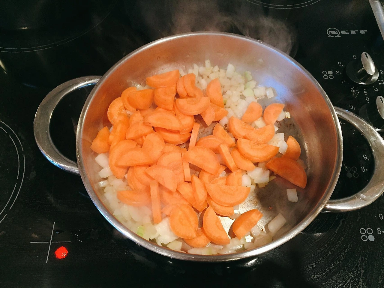 2. 양파를 먼저 볶다가 당근을 넣고 같이 볶아서 대충 익혀준다.