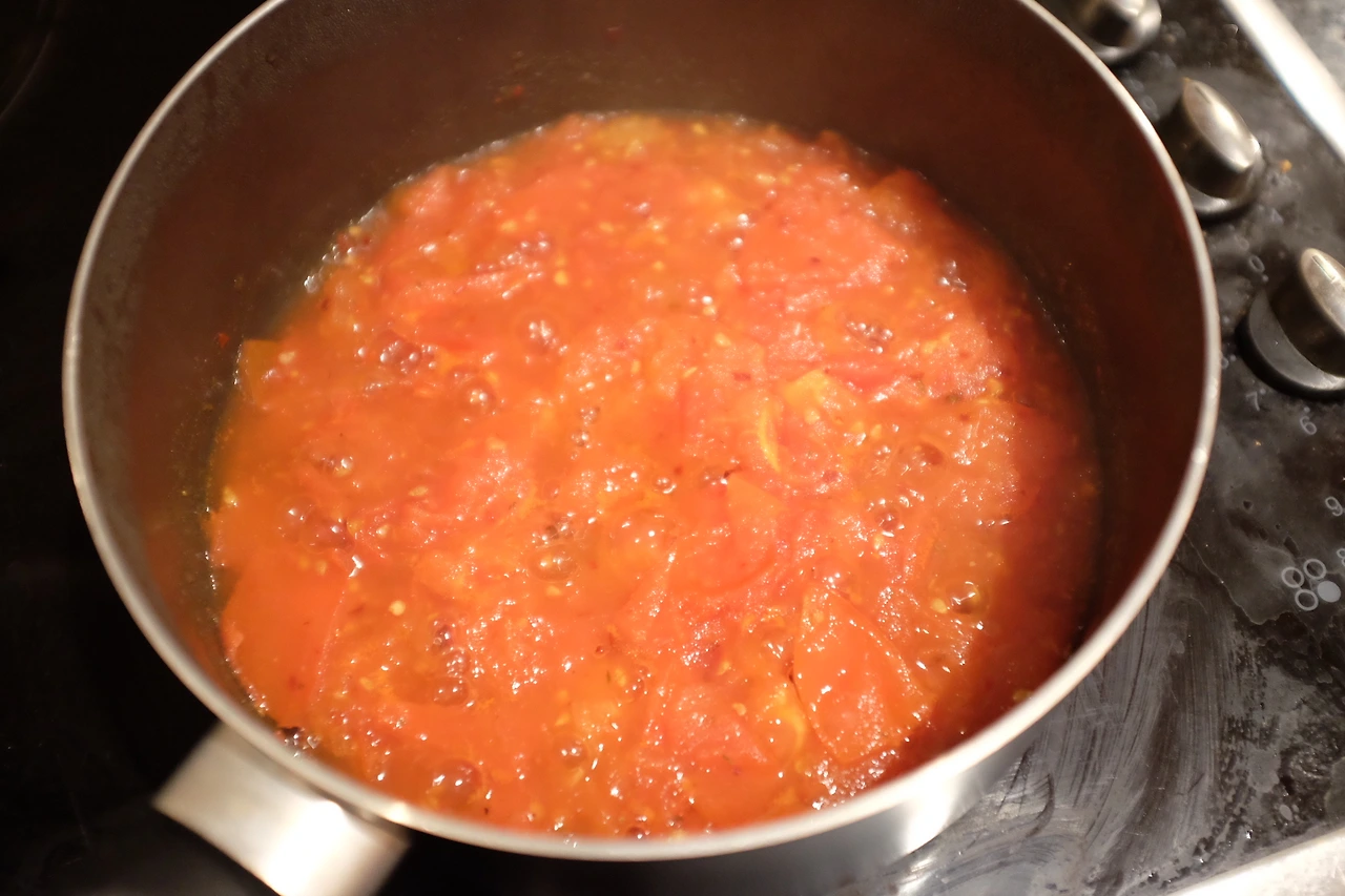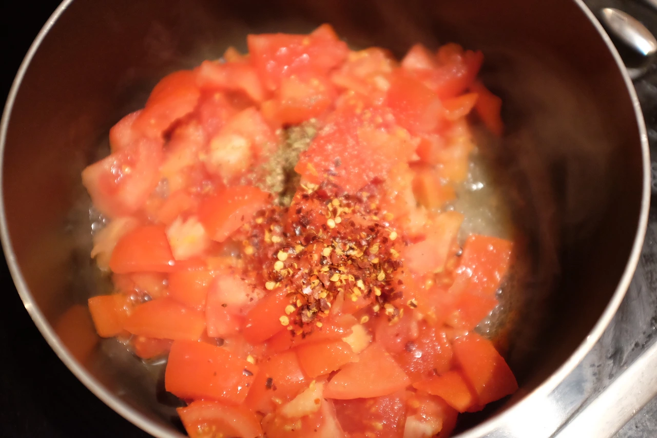 2. 토마토를 잘게 썰고 Crushed 칠리(고춧가루로 대체하거나 생략 가능하다), 허브, 후추를 넣고 끓인다.