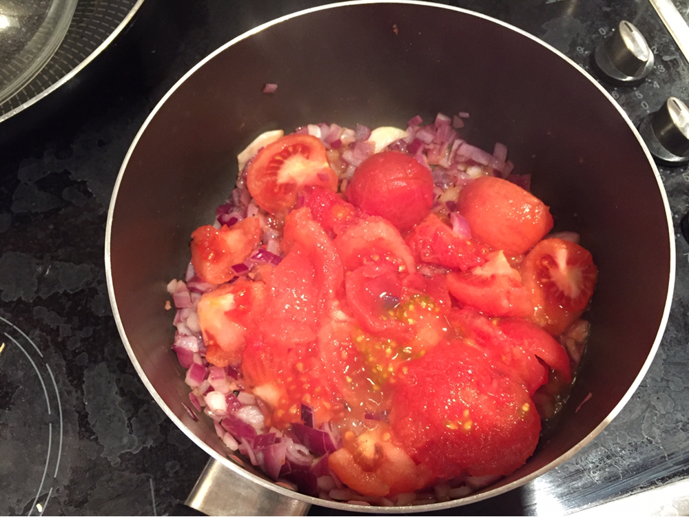 3. 토마토를 투하하고 중 약불로 죽이 될 때까지 끓여주고 간을 한다. (15분-20분)