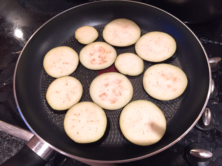 4. 소스가 끓는 동안 가지에 소금을 살짝 (아주 약간) 뿌리고 노릇 구워준다.