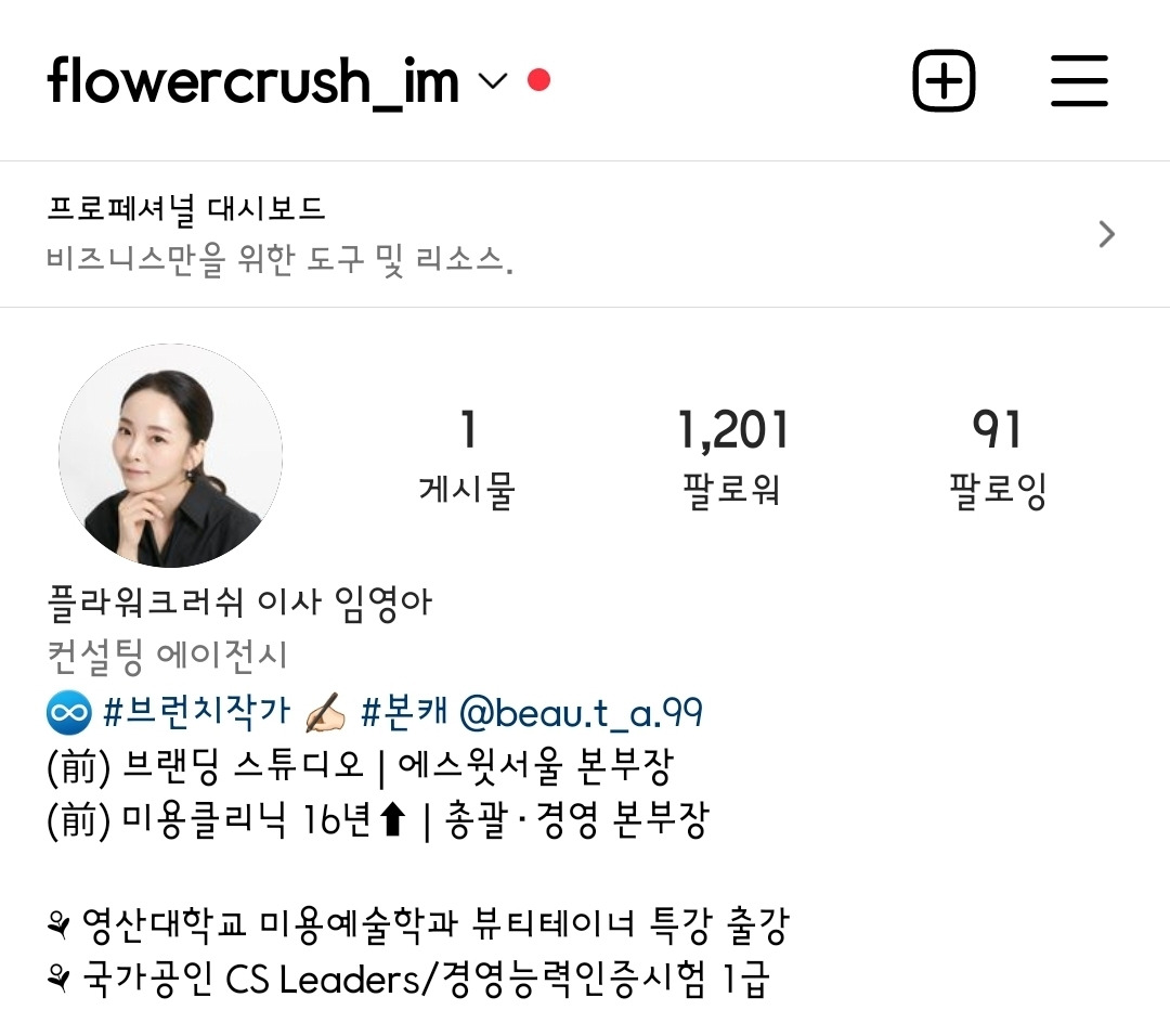 내용을 보면 어떤 회사 소속인지 소속을 먼저 밝히고 비즈니스 계정 카테고리가 보인다. 그리고 보여줄 나의 경력, 타이틀, 본 계정 등을 나열했다. 곧 멀티 링크도 아래에 추가될 예정이다. 그리고 회사 계정인 만큼 신뢰를 줄 수 있는 프로필 사진을 골랐다.