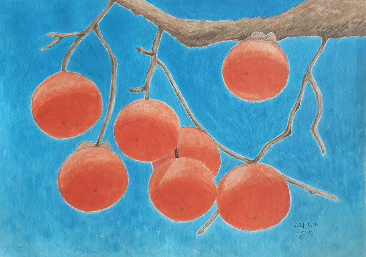 내친김에 오늘은 작년 가을, 학원생 '그룹 전시회' 하고 방치해 놓은 그림 중 맘에 드는 거, 몇 개 꺼내서 거실에 내놨어. 잘 그려서라기보다는 내 작품, 이니까 내 집에서 만큼은 소중하게 대접해야겠다는 생각이 들어서... 서툰 솜씨가 돋보이는 수준이기는 해도 '홍시 7남매' 그림이 보기 좋네.. 내 그림을 내 집에 걸어 놓는다는 취지에서는 손색이 없어. 오히려 내 그림이 더 좋을 수도 있지. 높은 애착감. 그지?