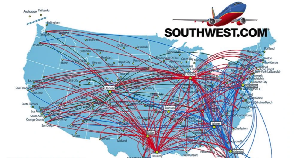 대부분의 항공사들이 사용하는 허브 앤 스포크(Hub and Spoke) 방식을 쓰지 않습니다. 노선의 모습이 자전거 바큇살 같다고 하여 허브 앤 스포크라고 불리는 방식은, 메인 거점(Hub)을 두고, 여러 스포크(가지)를 연결하기 때문에, 적은 노선으로도 많은 지점에 연결이 가능합니다. 그러나,