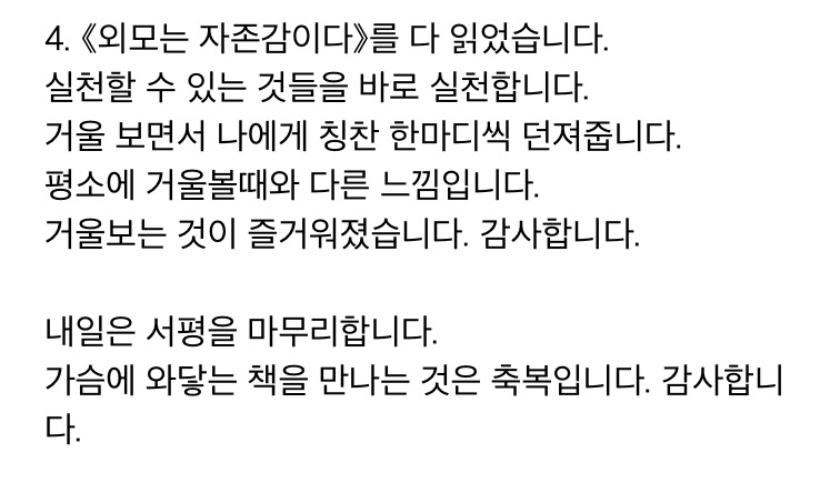 그런 의미로 외모를 가꾸는 것은 자기 자신을 사랑하는 방식이자 내가 원하는 나를 찾아가는 시작이 될 수 있다. 자신이 아름답다(Ps. 책에서도 밝혔지만 아름다움은 결코 외모만의 문제가 아니다)고 믿는 것이 중요한 이유는 그것이 자신감의 근원이 되기 때문이다. 자신감을 가지고 있는 사람은 자신이 원하는 것을 행동으로 옮길 힘을 가지고 있다. 그리고 자신이 아름답다고 믿는 사람은 자신이 원하는 것을 행동으로 옮길 가능성이 높다.