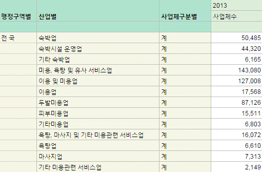 안 하는 것인가, 못하는 것인가? 우선 이 시장이 매력적이지 않은 시장은 아닌지 여러모로 분석해 보았다. 한국 화장품 시장 규모는 2013년 기준 약 7조원이다.(최근 자료를 찾을 수가 없었다.ㅠㅠ) 이렇게 수치를 들으면 감이 잘 오지 않아 필자는 늘 다른 대조할만한 수치를 같이 찾아 비교 분석한다. 2015년 한국의 전자상거래 시장 규모가 약 40조 원, 2013년 중국의 게임 시장 규모는 약 14조 7천억 원. 화장품 시장규모보다 낮은 시장 규모를 찾아보자. 국내 앱마켓 시장 규모는 약 3조 원, 모바일 광고 시장 규모는 1조 원, 웹툰 시장 규모는 4200억 원이라고 한다. 이쯤되면 화장품 시장 규모는 결코 적은 수치가 아니란 것이 느껴진다. 국내 앱마켓 시장 규모보다 2배 이상 높은 시장이 화장품 시장인 것이다. 게다가 뷰티 시장은 헤어샵, 피부관리샵, 네일샵과 같이 오프라인에서 받는 서비스까지도 엮을 수 있기 때문에 이 부분의 수치까지 함께 봐야 한다. 그래서 전국의 이/미용 산업 현황을 찾아봤다. 물론 이것도 함께 대조할 데이터를 함께 찾아봤다. (출처: 국가 통계 포털)