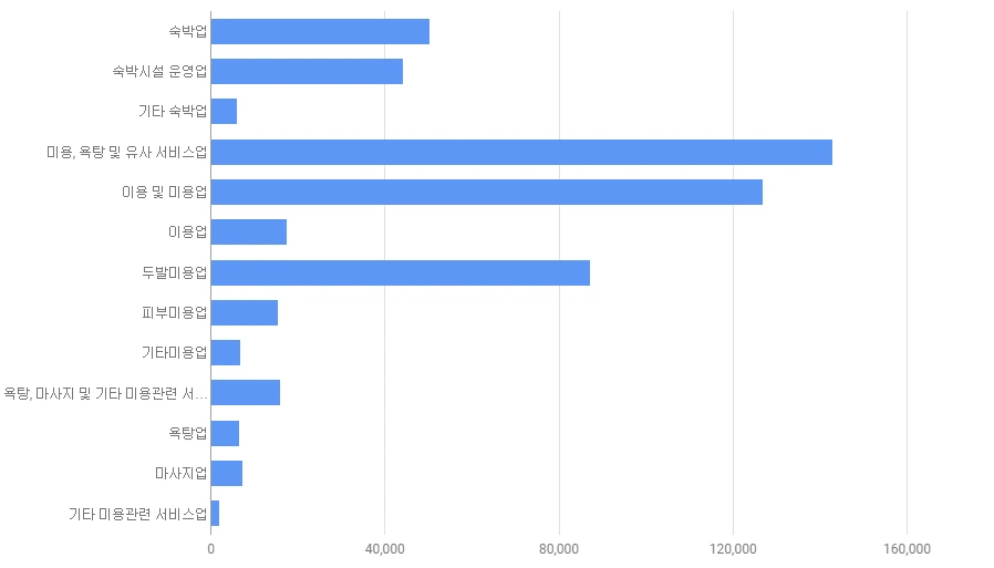 요즘 한창 핫한 야놀자가 타겟팅하는 시장인 숙박업과 비교해 보기로 했다. 국가 통계 포털에 잡히는 숙박업 사업체는 약 5만여 개, 이용 및 미용업 업체는 약 12만여 개이다. 숙박업보다 2배 이상 높은 수치이다. 물론 여기에 피부미용업, 네일업, 왁싱 등 다양한 미용서비스 업체들까지 더하면 숙박업의 몇 배 이상은 될 거라 예상된다.