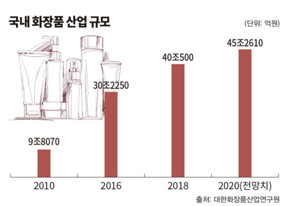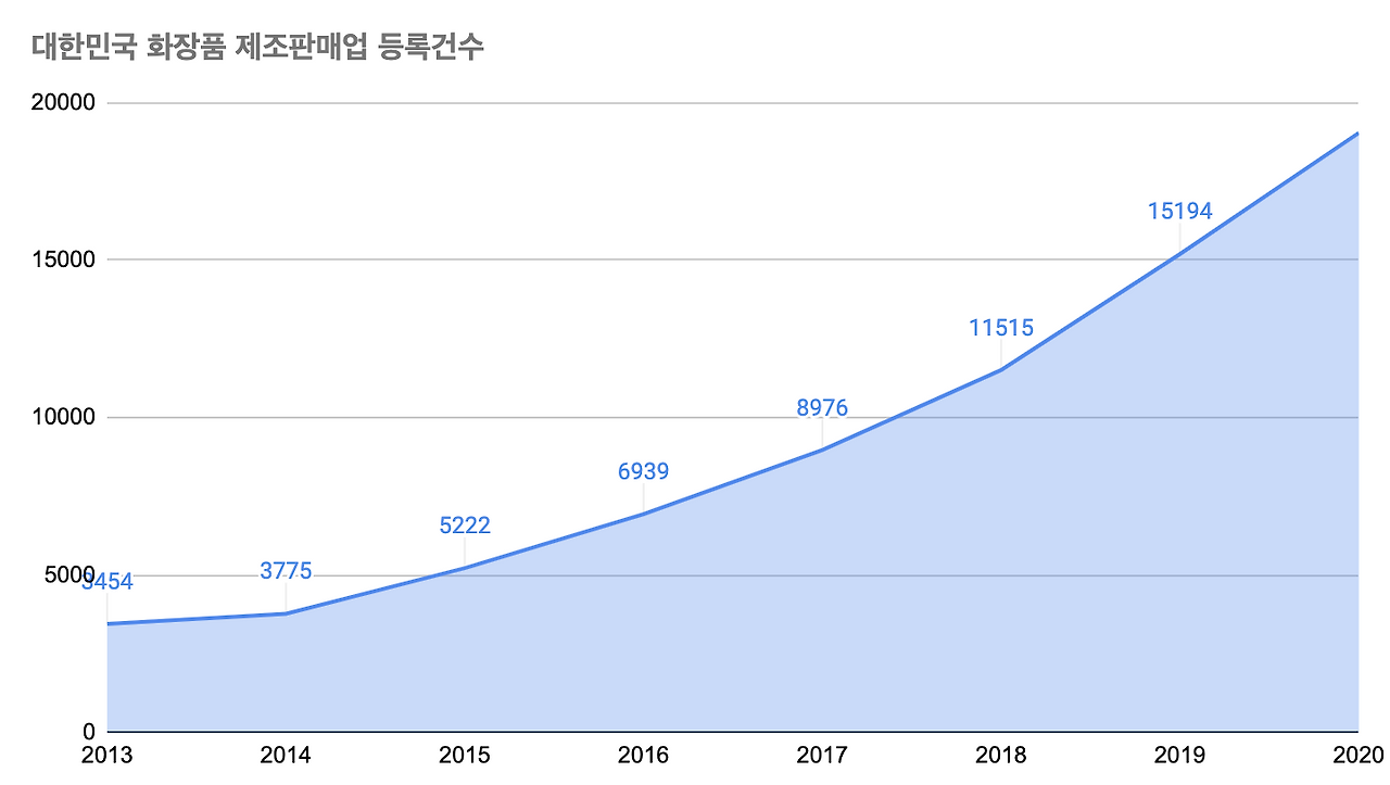 2015년에서 2019년 사이는 화장품 시장이 급성장했던 시기다. 나는 이 시기를 대한민국 뷰티 버블 시대 또는 뷰티 황금기라 부른다. 마치 한국의 88 올림픽, 일본의 황금기를 연상케 할 정도로 이때에 대한민국의 화장품 시장은 정말 폭발적으로 성장한다. 이게 말로 들으면 감이 없으니 통계 데이터를 함께 보도록 하자.