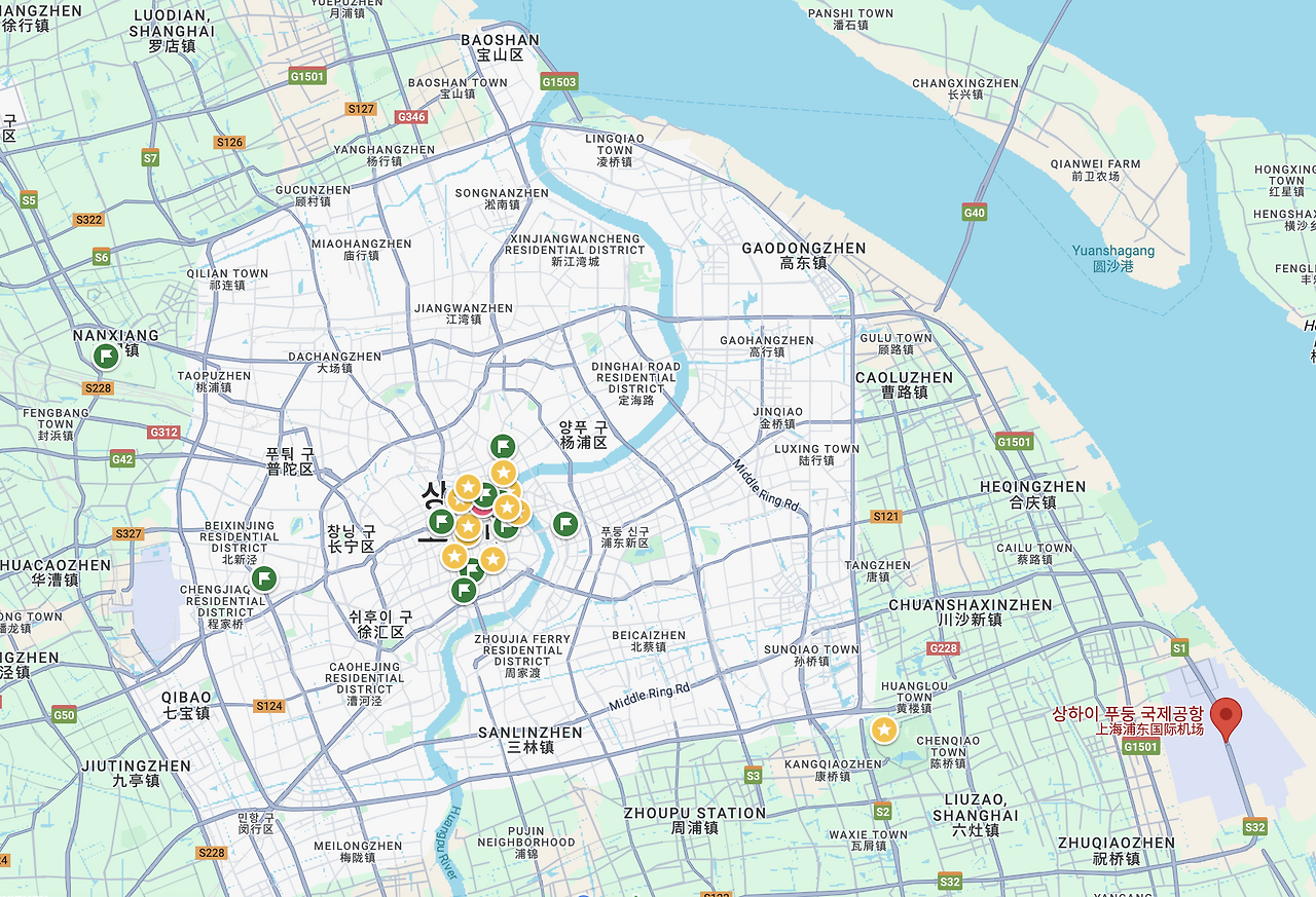상하이 1탄에서는 상하이를 가기 전에 미리 알아두고 챙겨야할 것들을 정리해 보았다. 상하이를 가기로 마음먹었다면, 상하이에서 어디를 가야할까. 상하이는 서울 면적에 무려 10배다. 상하이시의 인구만 해도 약2,500만명에 달한다. 이 넓디 넓고 인구 많은 상하이 시에서 실제로 주요하게 여행하는 지역은 아래 지도에서 노란색 표시가 있는 곳 정도다. 맛집과 여행지는 상하이에서 10년 정도 유학했던 친구들에게 맛집 추천도 받아보고, 유투브 육식맨 상하이편도 참고했다. 함께 상하이 여행을 간 친구는 이미 혼자 상하이 여행을 다녀왔어서 그 친구의 도움도 많이 받았다.