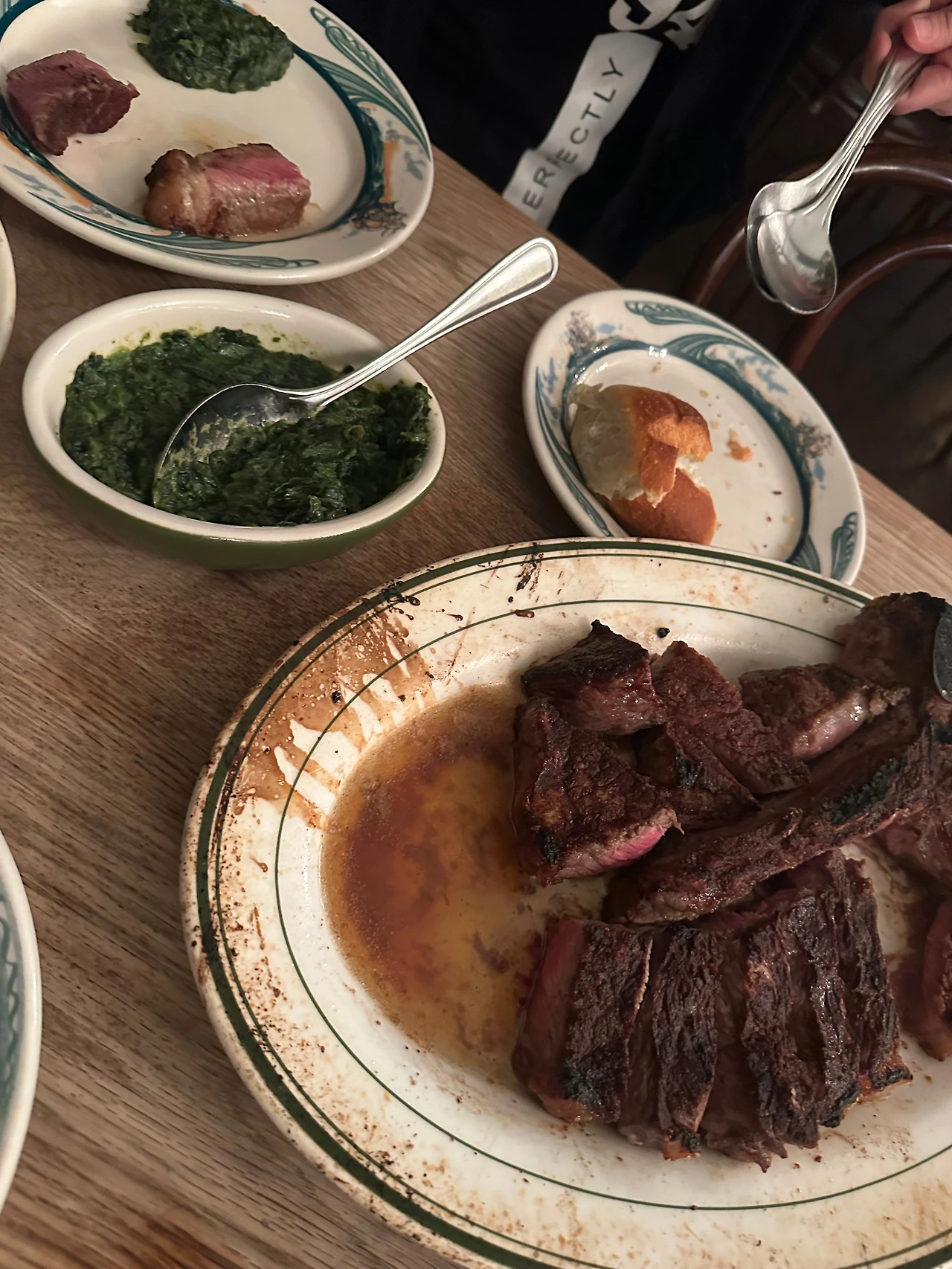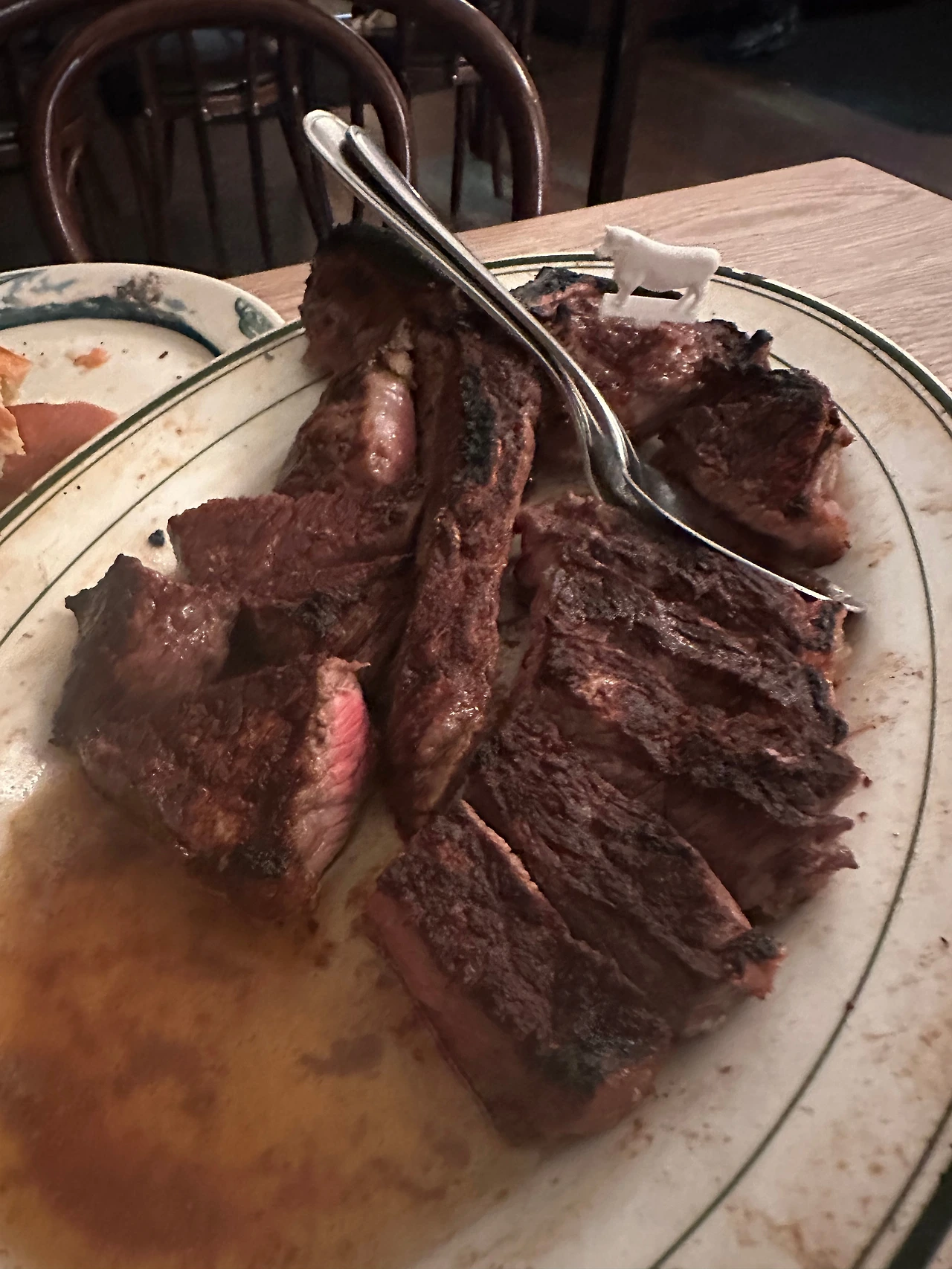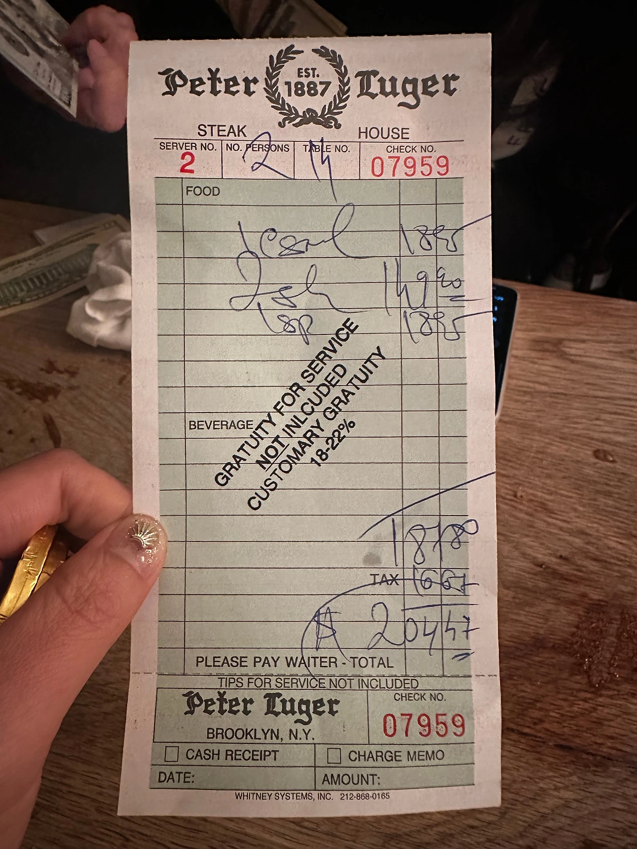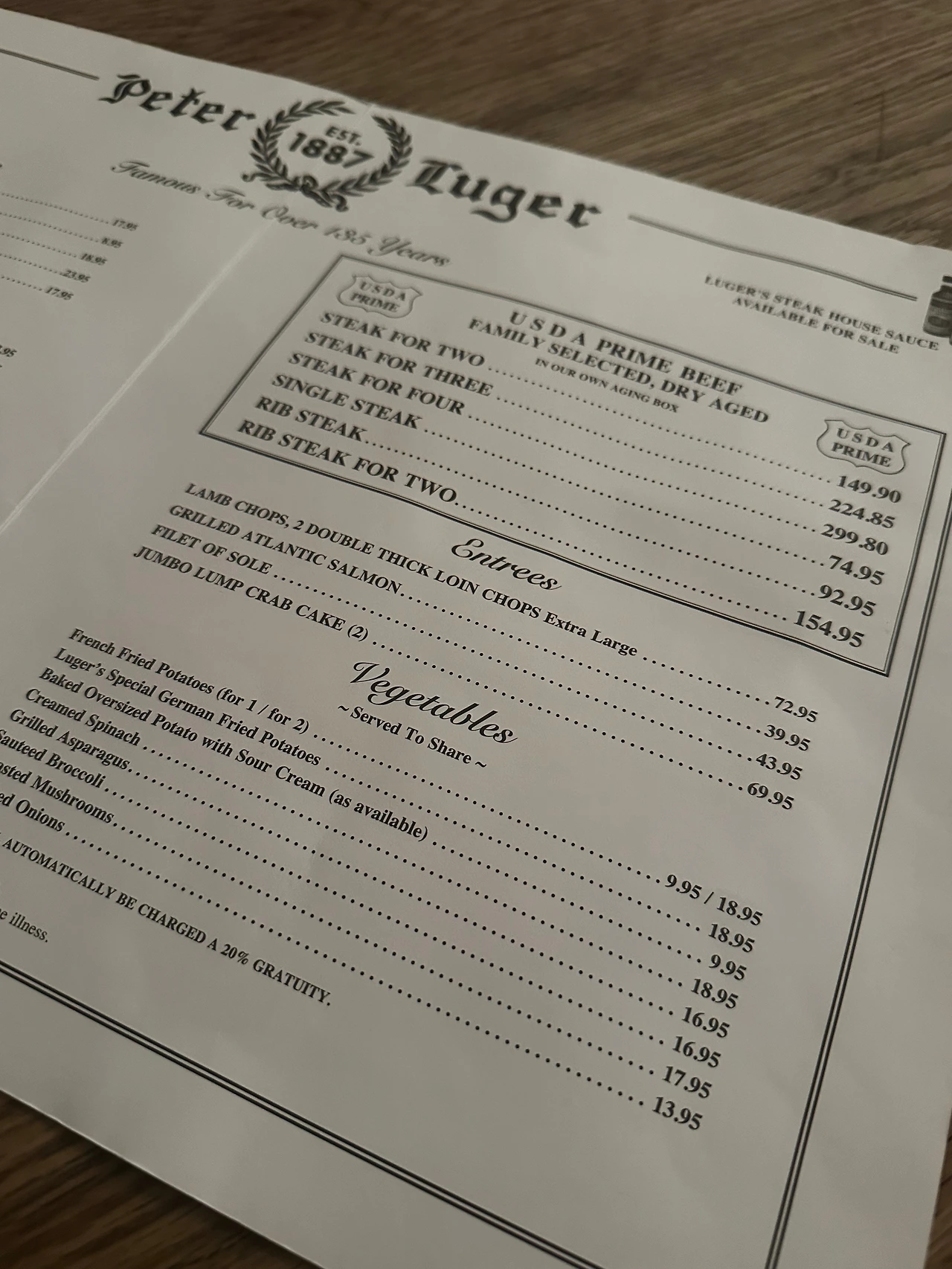 브루클린 윌리엄스버그에 위치한 Peter Luger Steak House는 1887년에 문을 연, 말 그대로 뉴욕 스테이크의 역사 같은 곳이다. 입구에 들어서는 순간부터 분위기는 단호하다. 화려함보다는 오래된 나무 테이블과 묵직한 공기, 그리고 ‘우리는 스테이크 하나로 승부한다’는 자신감 같은 것이 느껴진다. 메뉴는 단순하지만, 대부분의 사람들은 같은 선택을 한다. 포터하우스 스테이크 for two.