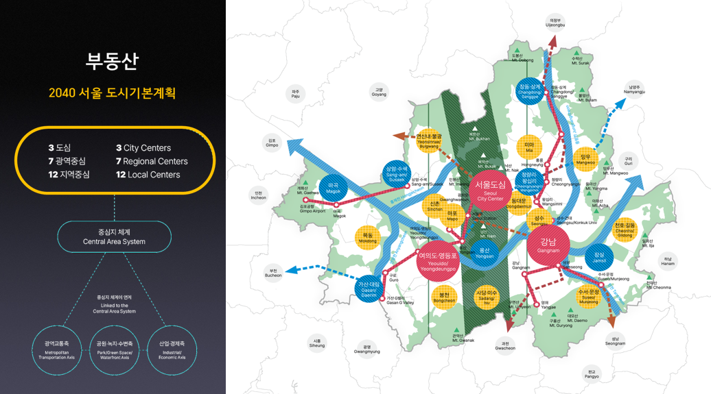 그 골격은 3대 도심(서울도심, 여의도·영등포, 강남), 7개 광역중심, 12개 지역중심입니다. 여기에 세 가지 큰 축이 연결됩니다.