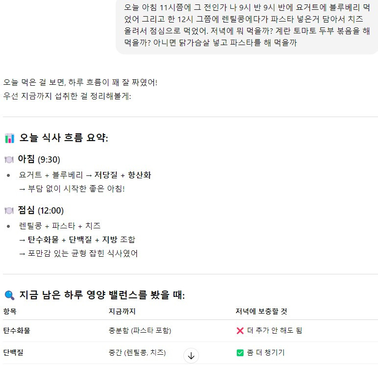 요즘 다양한 식단 기록 앱이 있지만 gpt에 하면 바로바로 피드백을 주기도 하고 gpt가 더 나아가 제 입맛을 바탕으로 필요한 영양소 이런것도 알려줘서 건강 관리에 효과적으로 쓰고 있어요.