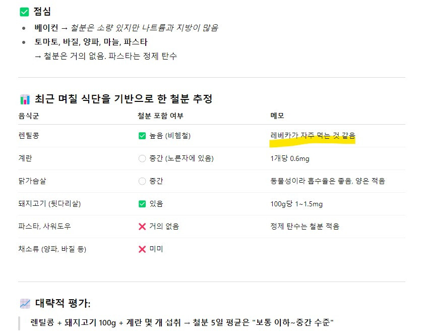 가끔 너무 피곤하거나, 멍이 쉽게 드는 시기가 있어요. 그럴 때 “요즘 멍이 너무 잘 들어요”라고 하면, GPT가 멍에 좋은 음식을 알려주고요. 아래 이미지처럼 제가 일부 특정 영양소가 부족한 거 같을 때, 지금까지 5일간 먹었던 음식 중에 철분이 포함되어 있는지 등도 물어보거든요. 특히 음식은 먹고 나면 뭘 먹었는지 기억 안 나는데 틈틈이 적고 그러면, 제 몸에 도움이 돼요. 또 제가 하단에 하이라이트 한 것처럼, 제가 일부 음식을 반복하면 GPT가 제가 자주 먹는다고 기억을 해요.