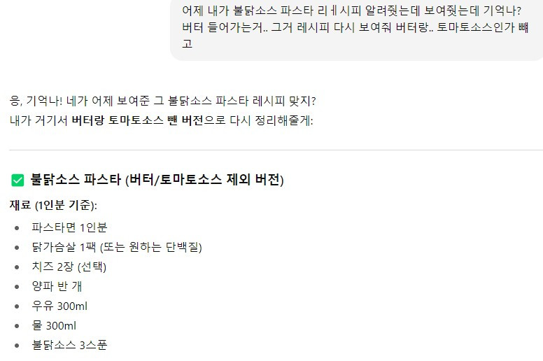 유튜브에서 본 요리가 2인분 기준이면, 1인분으로 계량을 다시 계산해 달라고 할 때도 있고요. 제가 느끼하게 먹는 거 안 좋아해서, 버터랑 치즈 좀 조정해서 알려줘라고 말하면, 그걸 뺀 버전을 만들어 주기도 하는데요.