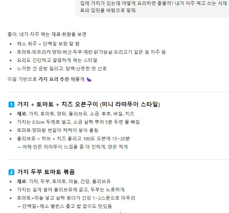 이런 식단 데이터가 쌓여서 GPT가 제가 어떤 음식을 좋아하는지, 어떤 식습관을 갖고 있는지 파악합니다. 그래서 “집에 가지가 있는데 어떻게 요리할까?”라고 물으면, 제가 클린 하게 먹는 걸 좋아한다는 걸 알고 그 스타일에 맞춰 메뉴를 추천해 줘요. 아래처럼 제가 채소 위주로 깔끔하게 먹는 거 보고 비슷하게 쭉 적어주는데 항상 이대로 따라 하진 않지만 대충 아이디어를 얻기도 해요.
