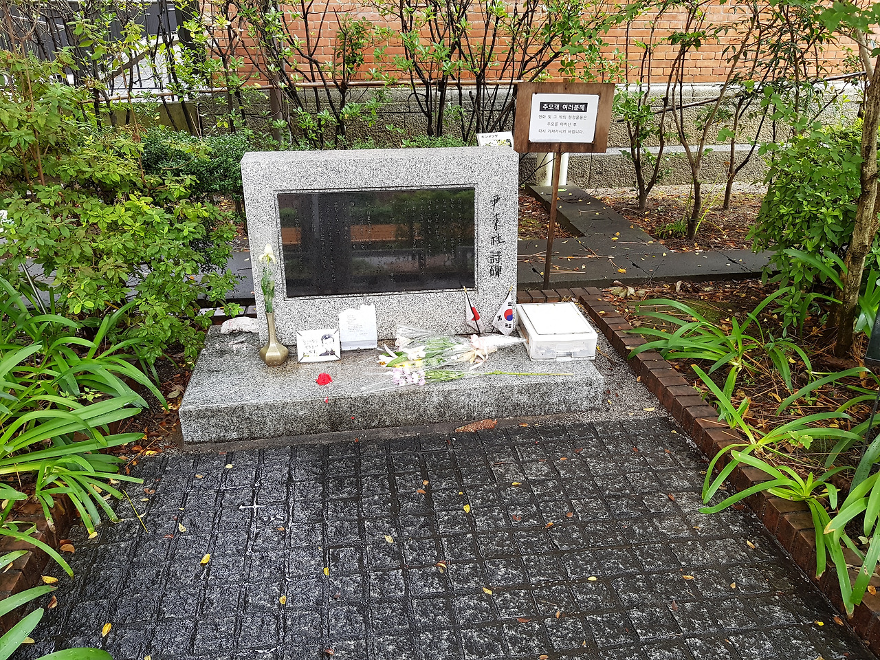 도시샤 대학은 교토에 있는 사립대학으로 윤동주 시인과 정지용 시인의 시비가 세워져 있다. 당시 나는 영화 '동주'를 인상 깊게 봤었기 때문에 윤동주 시인에 대한 관심이 많았다. 대학에 도착 후 윤동주 시인의 시비는 어렵지 않게 찾을 수 있었다. 시비 주변에 작은 태극기와 꽃다발이 놓여 있었기 때문이다.