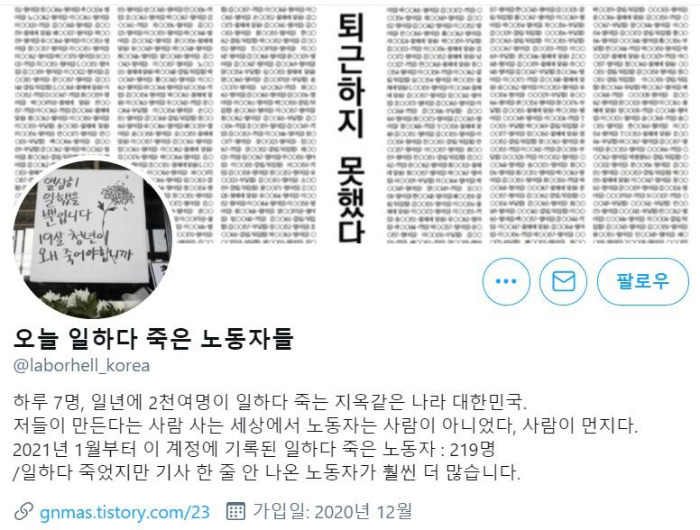 트위터에 ‘오늘 일하다 죽은 노동자들(@laborhell_korea)’라는 이름의 계정이 있다. 여기엔 매일 각종 노동 현장에서 사망한 노동자들의 기사가 공유된다. 그에 따르면 우리나라에선 하루 7명, 일 년에 2천여 명이 ‘일하다 죽는’다. K-pop, 스마트폰, 반도체 등 문화, 기술 측면에서 놀라울만한 경제 성장을 달성하고 있는 2021년의 대한민국에선 1분기에만 238명의 노동자가 산재로 사망하였다.(출처) 이러한 상황을 ‘지옥’으로 묘사하고 있는 프로필 설명에는 경고문이 붙어있다. ‘일하다 죽었지만 기사 한 줄 안 나온 노동자가 훨씬 더 많습니다.’