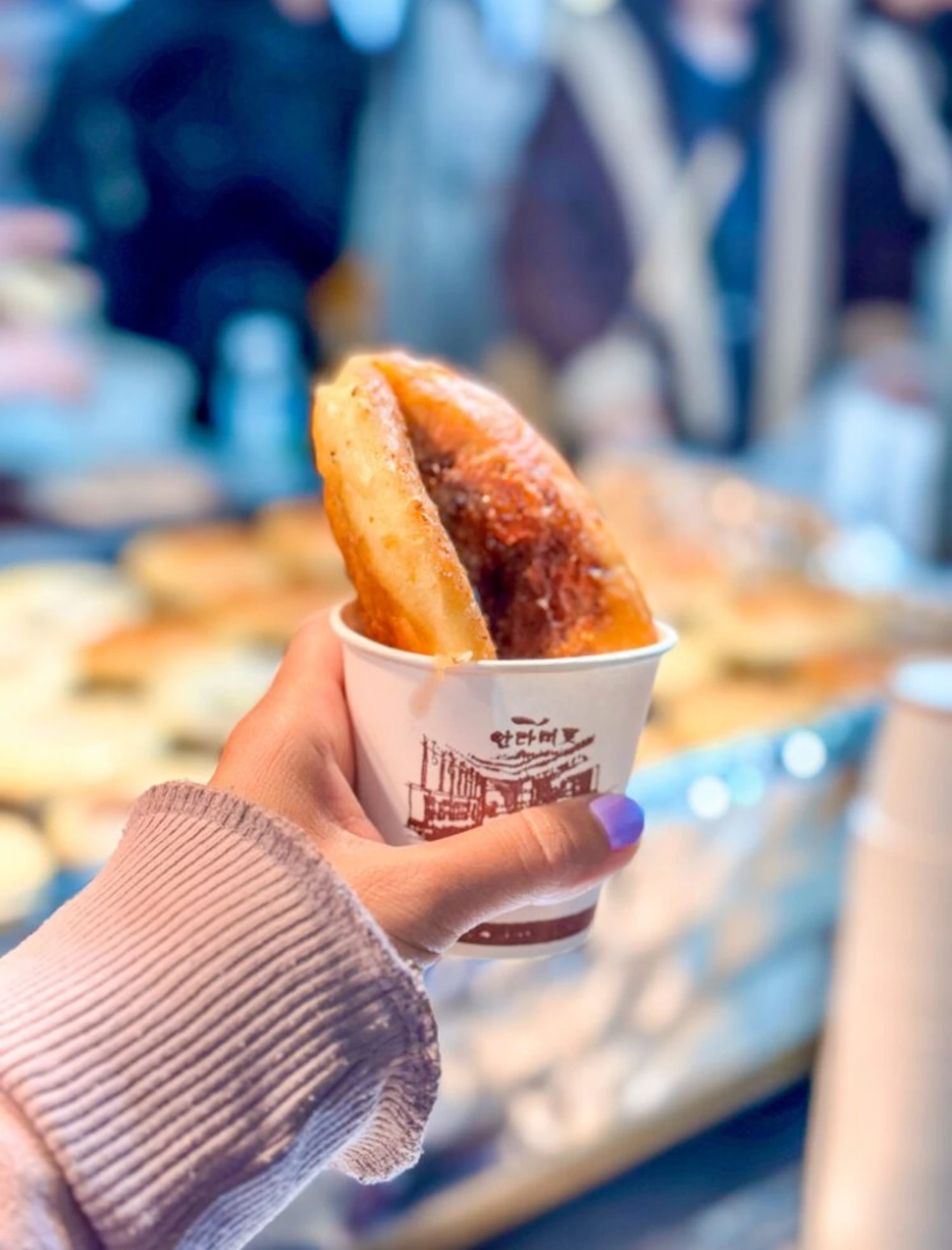 호떡을 받아 들면 고소한 기름 냄새가 코 끝을 스치고, 손바닥에는 따뜻한 온기가 퍼진다. 이때 베어 물면 후회할 만한 뜨거운 맛이 기다리고 있지만, 나는 기어이 입을 갖다 댄다. 첫 입을 베어 무는 순간, 뜨겁고 끈적한 달콤함이 입안에 천천히 번진다. 그 여운이 오래도록 남아, 한 모금의 아메리카노를 절로 부른다. 식감은 다르지만 호떡의 달콤한 꿀과 시나몬 향은 시나몬롤과 닮았다. 그래서 내가 시나몬롤을 좋아하는지도 모르겠다.