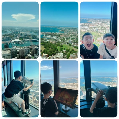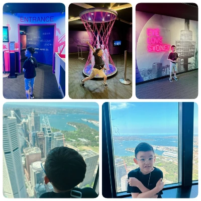 전망대 곳곳에는 터치 스크린과 망원경이 설치되어 있어, 시드니 랜드마크를 더 자세히 볼 수 있다. 해질 무렵이 인기 있는 이유를 알겠다. 노을과 야경이 함께라면 또 다른 모습의 시드니를 만날 수 있을 것 같다. 인생 네 컷 같은 사진 부스도 있어서, 아이들은 사진을 찍으러 들어갔다. 사진 속 표정들이 참 가관이다. 아들들이란.