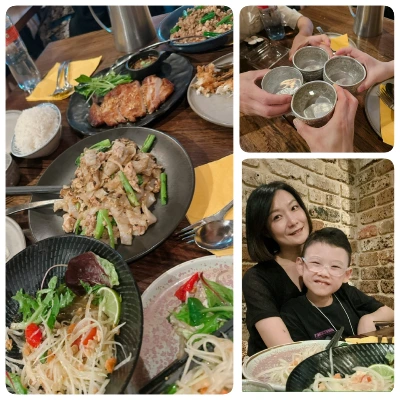기억력이 좋은 남편도 세세한 기억은 못하겠지만, 나름 기념일이니 보내주려고 사진도 몇 장 찍어본다. 아들과 둘만 왔으면 메뉴도 두 개 밖에 주문하지 못했을 텐데, 오늘은 넷이라 이것저것 푸짐하게 시킬 수 있어 좋다. 지호는 원래 내가 좋아하는 '팟씨유' 태국 볶음면을 좋아하지만, 오늘은 소프트쉘크랩에도 눈을 떴다. 조잘조잘 쉴 새 없이 떠들던 입은 이제 부드러운 게 껍질을 씹느라 무척 바쁘다.