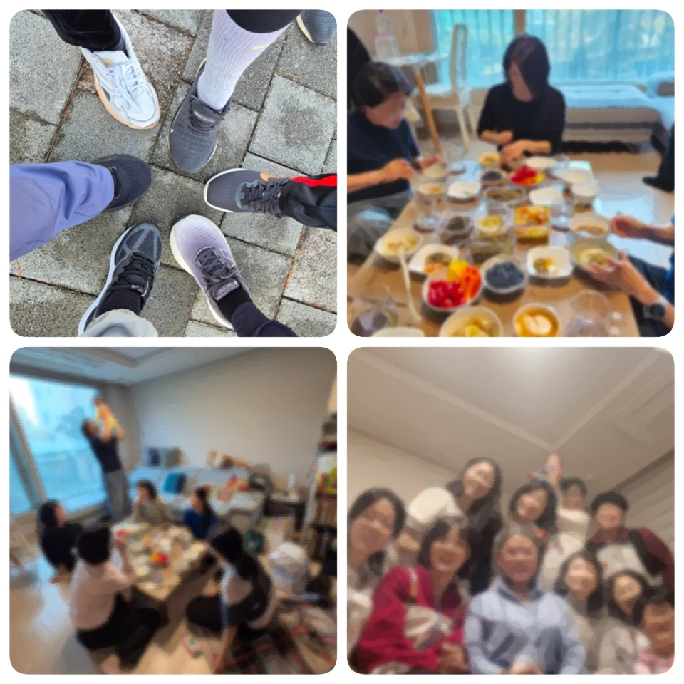 오고 가다 남으로 지나쳤을 법한 사람들이 한 팀으로 묶였습니다. 카페에서의 어색한 공기가 우리의 첫 만남으로 남아 있습니다. 그리고 우리는 함께 밥을 먹었습니다. 같이 요리를 하기도 하고, 운동도 했습니다. 그중 가장 많이 한 건 함밥이었어요. 각자 준비해 해 온 음식을 펼쳐놓고 함께 먹는 포트럭 식사였습니다. 비빔밥 데이도 떠오르고, 애리님까지 함께했던 성대한 만찬도 생각납니다.