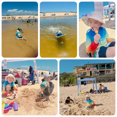 오늘의 점심은 정민언니가 만들어 온 꼬마 스시와 바닷가에서 파는 감자튀김. 어른들은 출발하며 픽업한 서브웨이 샌드위치다. 밖에서 먹으면 뭐든 꿀맛이지만 바닷가에서 놀다가 먹으니 더 맛있는 거 같다. 소금 뿌리지 말아 달라고 한 주문이 무색하게 소금이 한껏 뿌려진 감자튀김. 그래서 더 맛있는지 애들의 손은 멈출 줄을 모른다. 놀다가 아이스크림까지 하나씩 해치우고 한번 더 물놀이 타임. 신나게 파도도 타고 라군에서 유유히 물에 떠다닌다. 지호는 오늘도 한 마리의 활어가 되었다. 오후가 되니 사람들이 더 늘어난다. 호주사람들은 정말 바다를 서핑을 사랑하나 보다. 애들이 살짝 피곤한 기색을 보이자 우리는 베이스캠프를 접는다. 야외 샤워기에서 수영복 입은 채로 짠 바닷물을 씻어낸다. 옷만 대충 갈아입고 차에 몸을 싣고 출발. 꼼꼼한 샤워는 집에 가서 따뜻한 물로 하는 걸로.