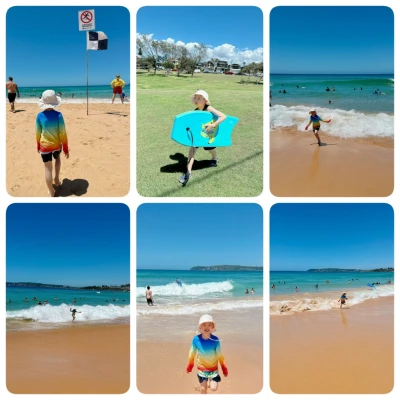 시드니 근교의 많은 해변 중에서 우리의 목적지는 시드니 북쪽에 있는 North Curl Curl Beach. 예전에 와 본 적이 있는 거 같은데 언니가 아니란다. 해변은 워낙 비슷하게들 생겼다. 예전에 자주 다녔던 바닷가도 옆에 얕은 라군이 있어서 잘 놀았던 기억에 내가 착각했나 보다. 토요일 아침 차로 한 시간을 달려서 도착한 바닷가 마을. 동네가 참 고급지다. 보통 주차장과 해변까지의 거리가 꽤 있어서 짐을 운반하기 위한 웨건이나 트롤리는 필수. 햇빛을 가려줄 선셰이드, 음식과 물이 담긴 아이스박스, 캠핑의자를 차곡차곡 쌓아서 언니가 트롤리를 끌고, 나는 옷과 선크림 같은 잡동사니 가방들을 양쪽으로 짊어지고 모래놀이 도구를 든다. 애들은 바디보드를 하나씩 짊어지고 다 같이 바닷가로 이동. 탁 트인 바다가 우리를 맞이한다. 지호는 이미 마음을 빼앗긴 듯한다. 선셰이드를 친다고 모두들 바쁘게 움직이는 동안 우리 아들만 넋을 잃은 채 바다만 하염없이 바라보고 있다.