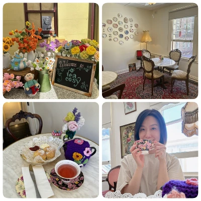 티코지란 티팟, 차를 우리는 주전자를 따뜻하게 유지하기 위해 입히는 '찻주전자 옷/덮개'를 말한다. 주로 손뜨개나 퀼트로 만드는데, 이곳의 컨셉은 손뜨개 티코지다. 그래서 테이블마다 손뜨개 바늘과 실이 담겨 있는 바구니가 있다는 것도 티코지만의 매력이다. 혼자 차를 마시며 손뜨개를 하는 사람도 있고, 다 같이 손뜨개를 하며 티 타임을 즐기는 팀도 있다. 물론 나처럼 손뜨개에는 관심이 없고 스콘에만 진심인 사람들도 있다. 다들 각자의 방식으로 차 마시는 시간을 즐긴다. 야외에 앉았다가 따뜻한 차를 즐기기엔 곧 더워질 거 같아서 안으로 자리를 옮겼다. 가파른 계단을 올라가면 영국풍으로 꾸며진 작은 티룸 두 개가 나온다. 에어컨은 없었지만 천장에서 팬이 돌아가고 창문으로 바깥바람이 살랑살랑 들어온다. 호주에 아는 사람이 남편 밖에 없었을 때. 남편은 공부하느라 바빴을 때. 가끔 스콘 생각이 나면 혼자 오곤 했던 곳이다. 따뜻한 차와 플레인 스콘 두 개를 시켰다. 오늘은 손뜨개로 만든 보라색 티코지에 당첨이군. 매번 어떤 색깔, 어떤 디자인의 티코지가 걸릴까 기대하는 것도 이곳만의 재미이다. 갓 구운 따뜻한 스콘과 라즈베리 잼, 클로티드 크림까지. 완벽하다.
