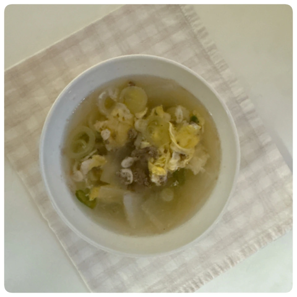먼저 무는 나박 썰기를 합니다. 시간이 촉박하면 빠른 조리를 위해서 더 얇게 썰어주세요. 냄비에 썬 무와 소고기 국물 페스토 한 팩, 그리고 물 200ml를 넣고 끓입니다. 끓기 시작하면 나머지 물을 두 번에 나누어 넣어요. 총 800ml의 물이 필요해요. 간은 새우젓 1t를 넣고 맛을 보며 맞추어주세요. 썰어 놓은 대파도 넣고, 후추도 살짝 뿌려요. 무가 투명하게 익으면 불을 끕니다. 계란을 풀어 붓고 그대로 뚜껑을 잠시 닫아두세요. 아이도 어른도 좋아하는 뭇국 완성이에요.