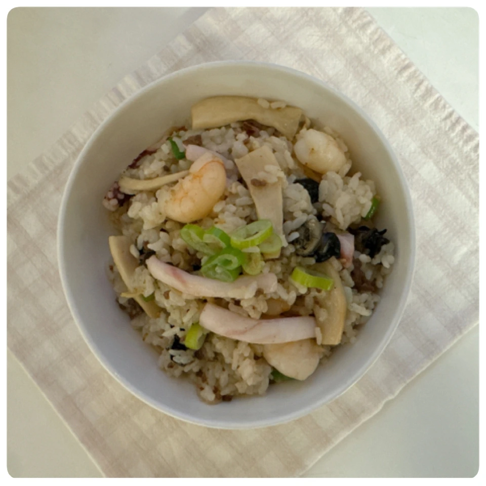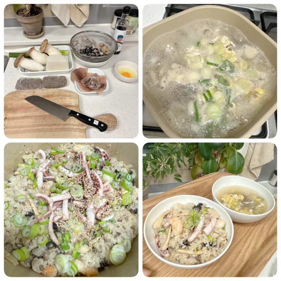 손질하고 자른 오징어는 버터에 살짝만 볶아서 건져두어요. 너무 오래 볶으면 자칫 질겨질 수 있으니까요. 같은 냄비에 소고기 국물 페스토 한 팩과 나머지 해물을 살짝 볶다가 버섯도 넣어 볶습니다. 이때 까나리 액젓 한 숟갈로 간을 맞추어요. 밥을 넣고 잘 섞은 뒤, 김이 잘 올라오도록 군데군데 구멍을 내주어요. 이제 불을 줄이고, 익혀놓은 오징어와 초록초록한 쪽파를 썰어 올려주세요. 뚜껑을 닫고 5분 두면 완성입니다. 잘 섞어서 통깨와 참기름 또는 들기름까지 더해주면 냄새가 당장 한입 떠서 입안으로 넣고 싶게 만들어요. 과정은 간단하지만 보기엔 일품요리 같은 해물 솥밥이에요.