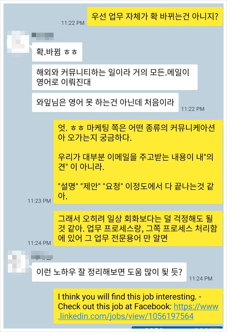 신입이었고, 주어진 업무 자체가 복잡하지 않았기에 실제 제가 업무에서 특히 영문이메일로 작성해야 할 내용은 단순 & 반복이었어요. 이메일 내용을 거의 ctrl c+v 하면 될 정도로요. 점점 업무에 익숙해질 때마다 업무의 난이도가 높아져서, 살짝 벅차다 싶을 때도 있었지만, 결국은 부서 자체가 바뀌지 않는이상 내가 하는 업무의 큰 맥락에서의 커뮤니케이션은 크게 벗어나지 않고 반복되더라구요.