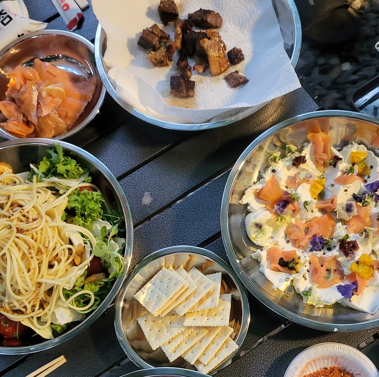 먹는 것에 한 진심인 나보다도 더한 진심을 보여준 언니는 손이 많이 갔을 법한 일인데도 재료 손질까지 다 해왔다. 남편과 내가 준비한 건 배불리 먹을 양고기, 돼지고기 목살, 부어서 끓이기만 하면 되는 순댓국 그리고 라면 5 봉지, 짜파게티 4 봉지다. 요리랄 것 없이, 부재료도 그다지 필요치 않은 간편한 것들 뿐이다. 일부러 쉬운 길을 택한 것은 아니었지만, 언니의 아이디어에 비하니 빈약한 건 사실이다. 그 후로도 언니네 큼지막한 아이스박스 속에서는 난 생각조차 해보지 않았던 재료들이 술술 나온다.